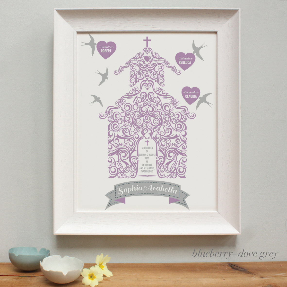 This personalised contemporary framed print is a perfect way to celebrate a Christening, Baptism or Naming Day. The framed print features a stylish church with room for the date and location in the doorway, hearts for the Godmother and Godfathers carried by delicate swallows and a banner at the bottom for the baby's name.