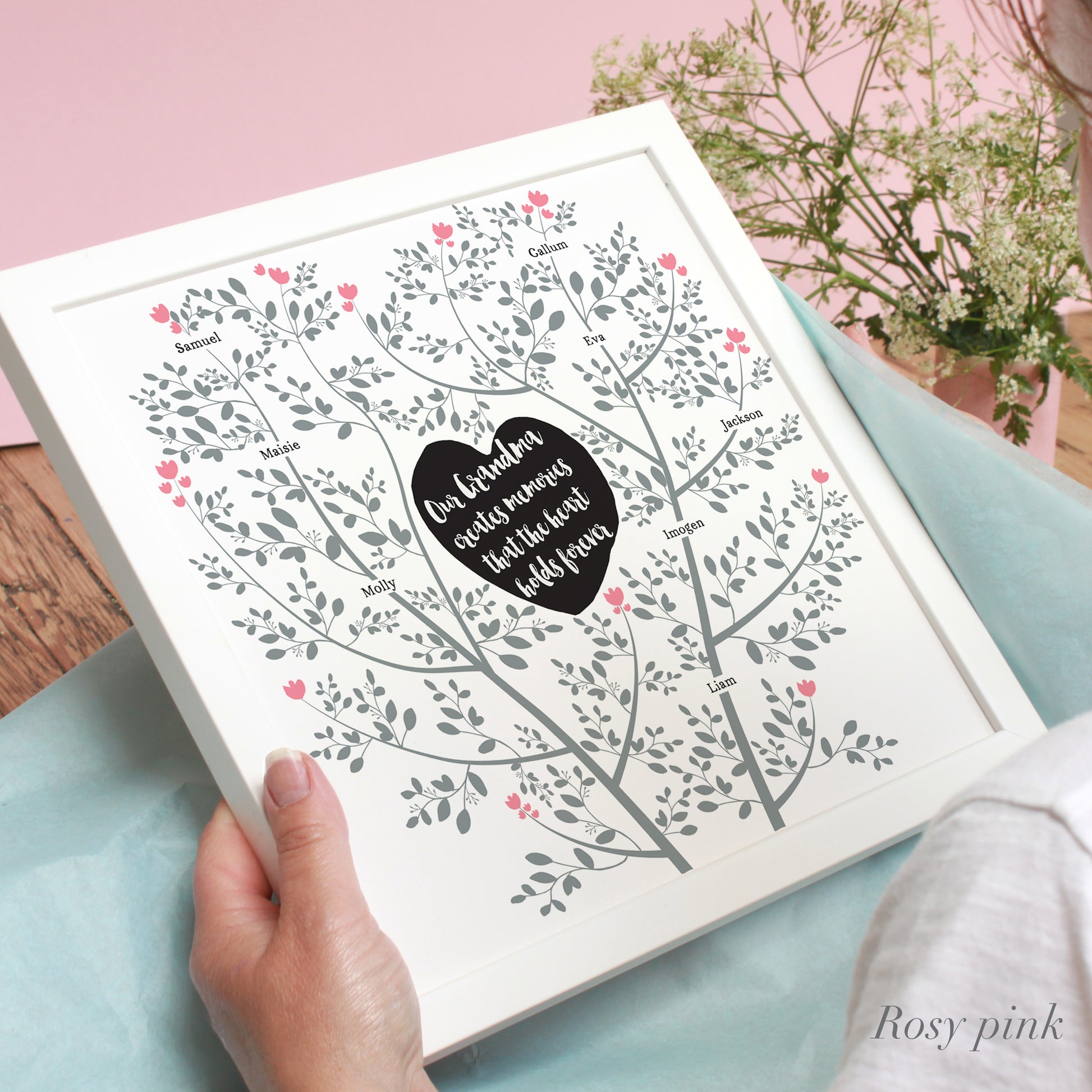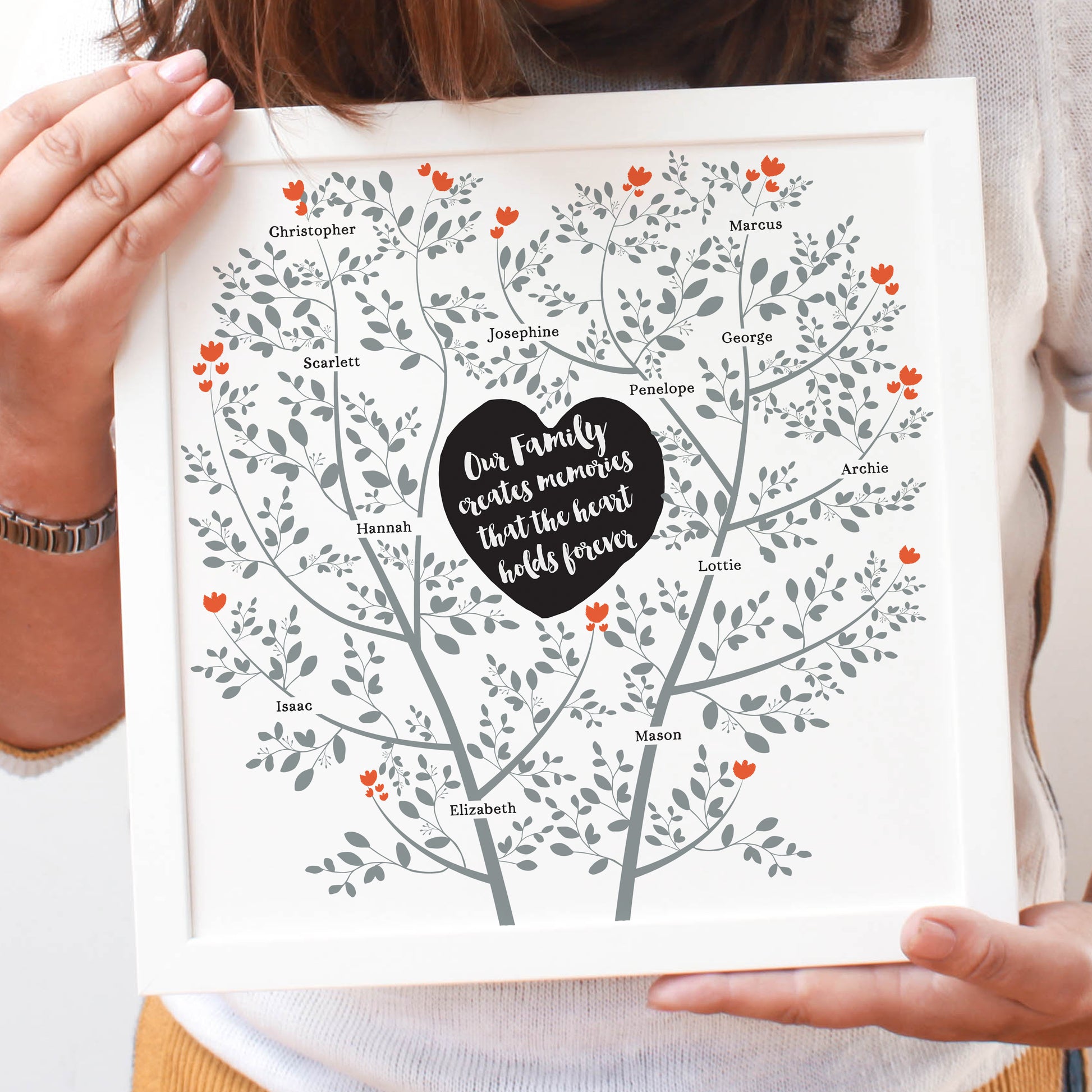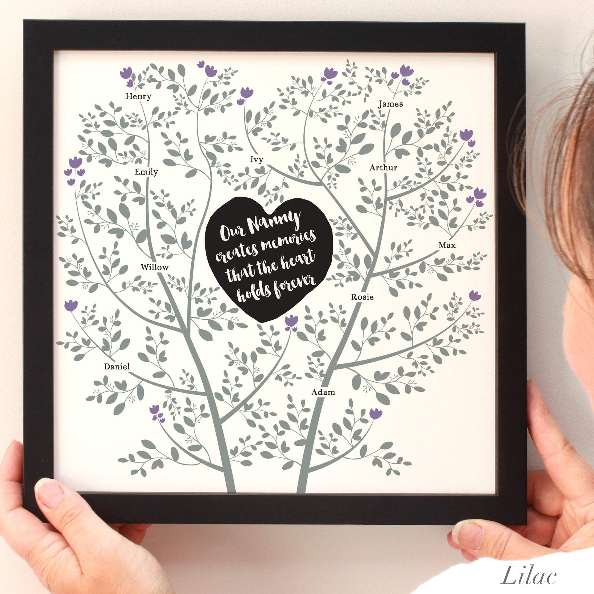 The names on the tree are in clear, black lettering and you can choose to feature up to 20 names. You can choose to feature the word 'Family' and then have all your family member names on the tree. Or you can choose to have Nanny or Grandad's name in the heart with their grandchildren's names on the tree.