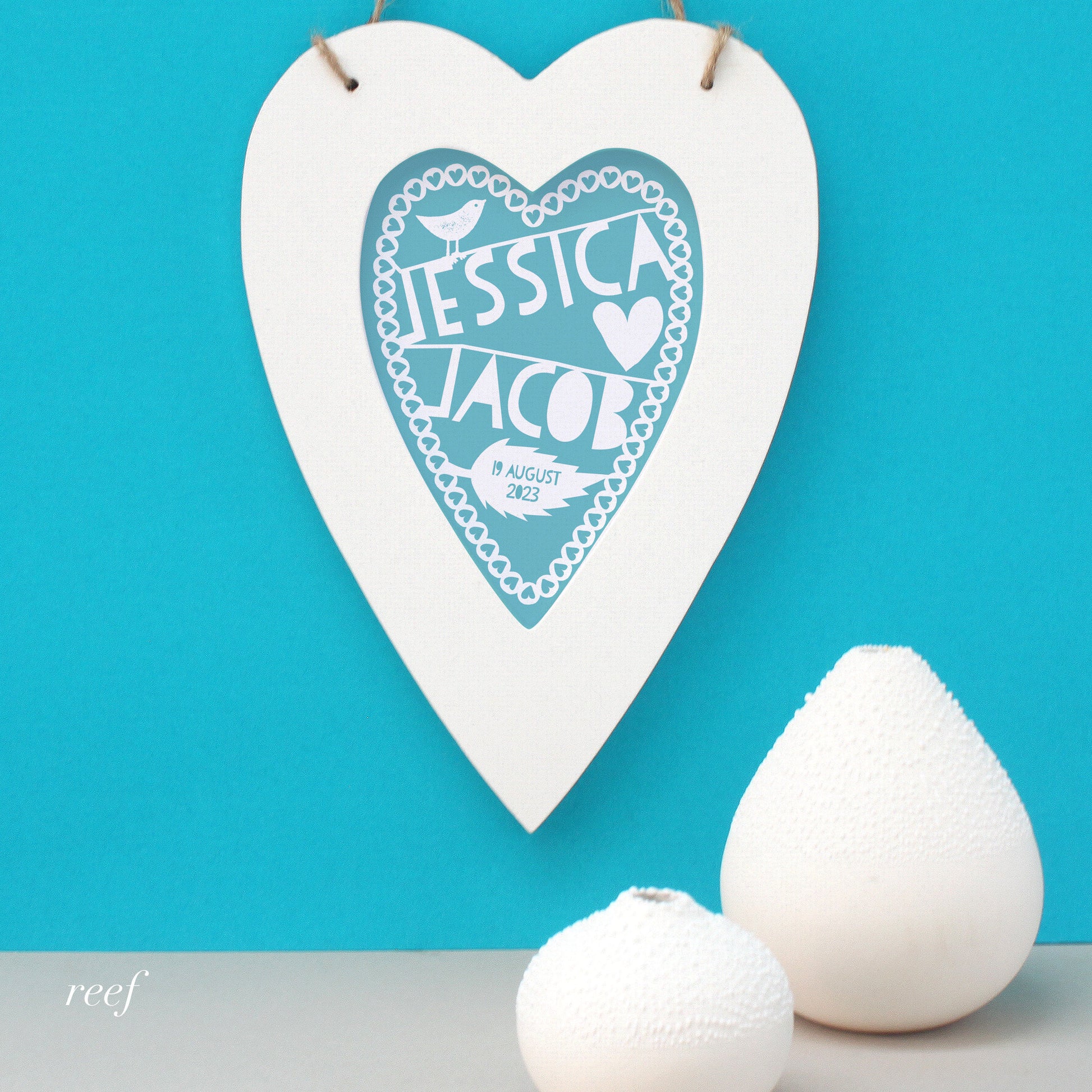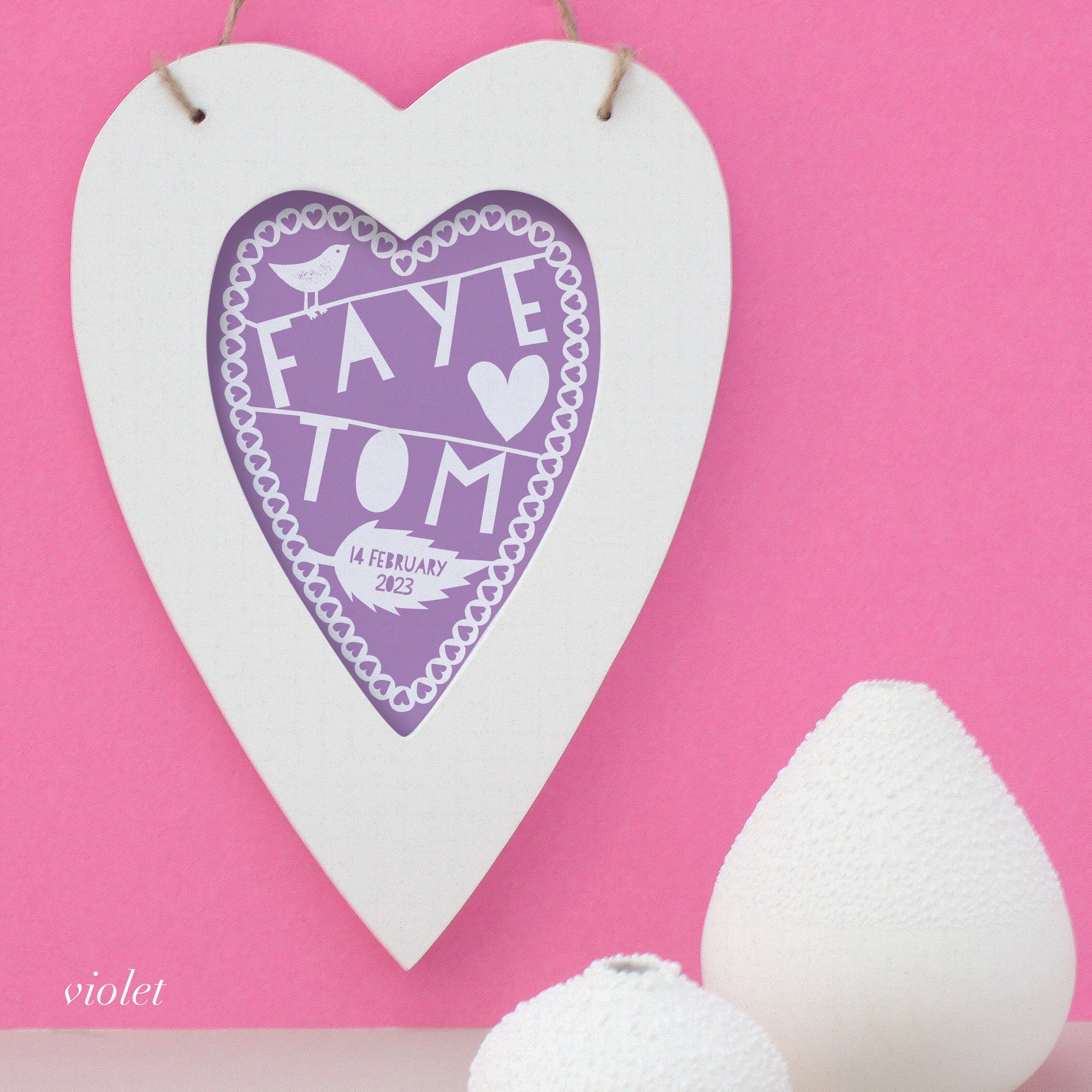 This beautiful personalised framed heart is perfect to celebrate a special Wedding, Engagement or Valentine's Day. Featuring the couple's names in white on soft chalky backgrounds, we have suggested some colours but please message us if you want your own colour.