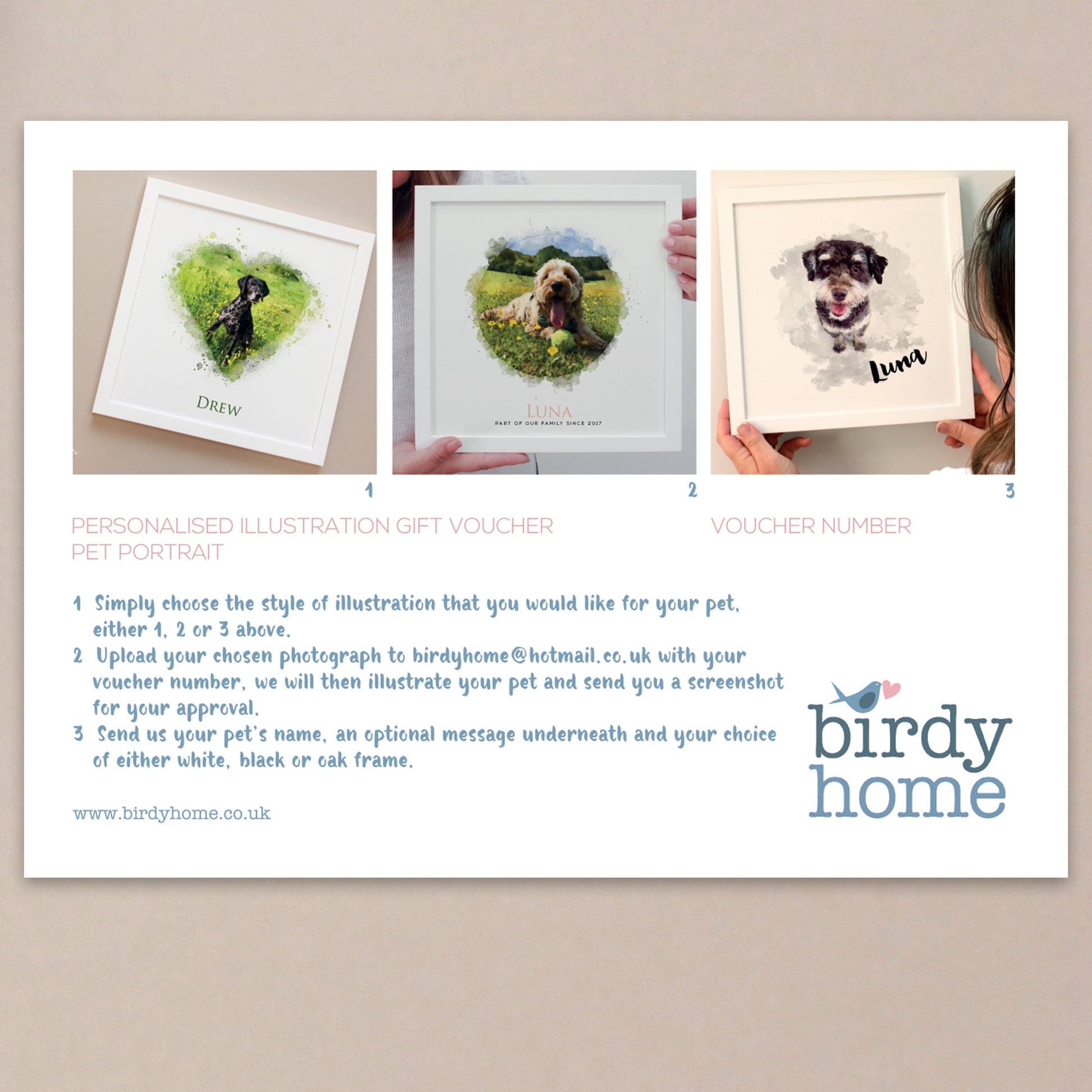 The voucher entitles the recipient to a bespoke illustration/print of their choice. It shows examples of illustrations and gives instructions of how the recipient can send a photo of their choice to us to be illustrated.