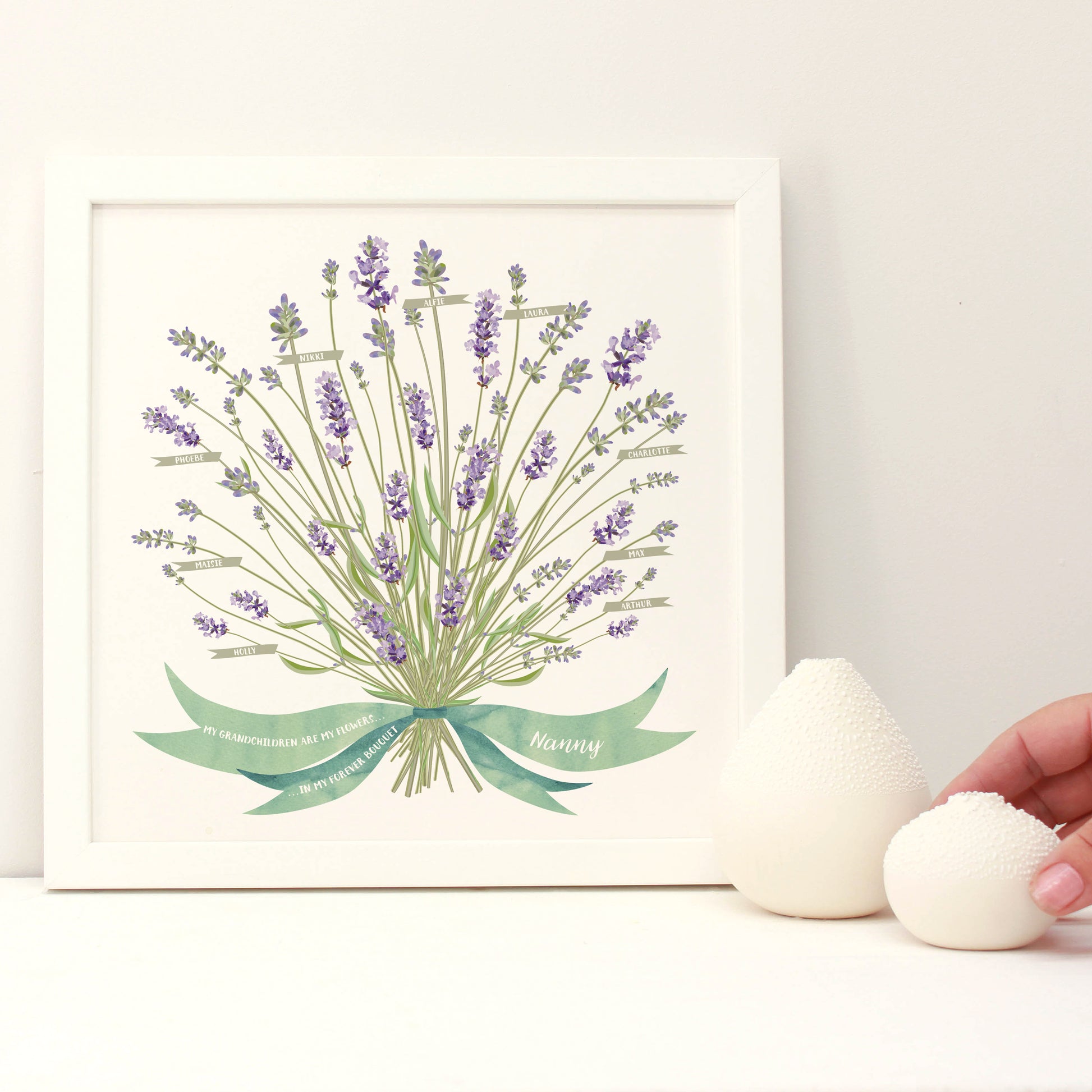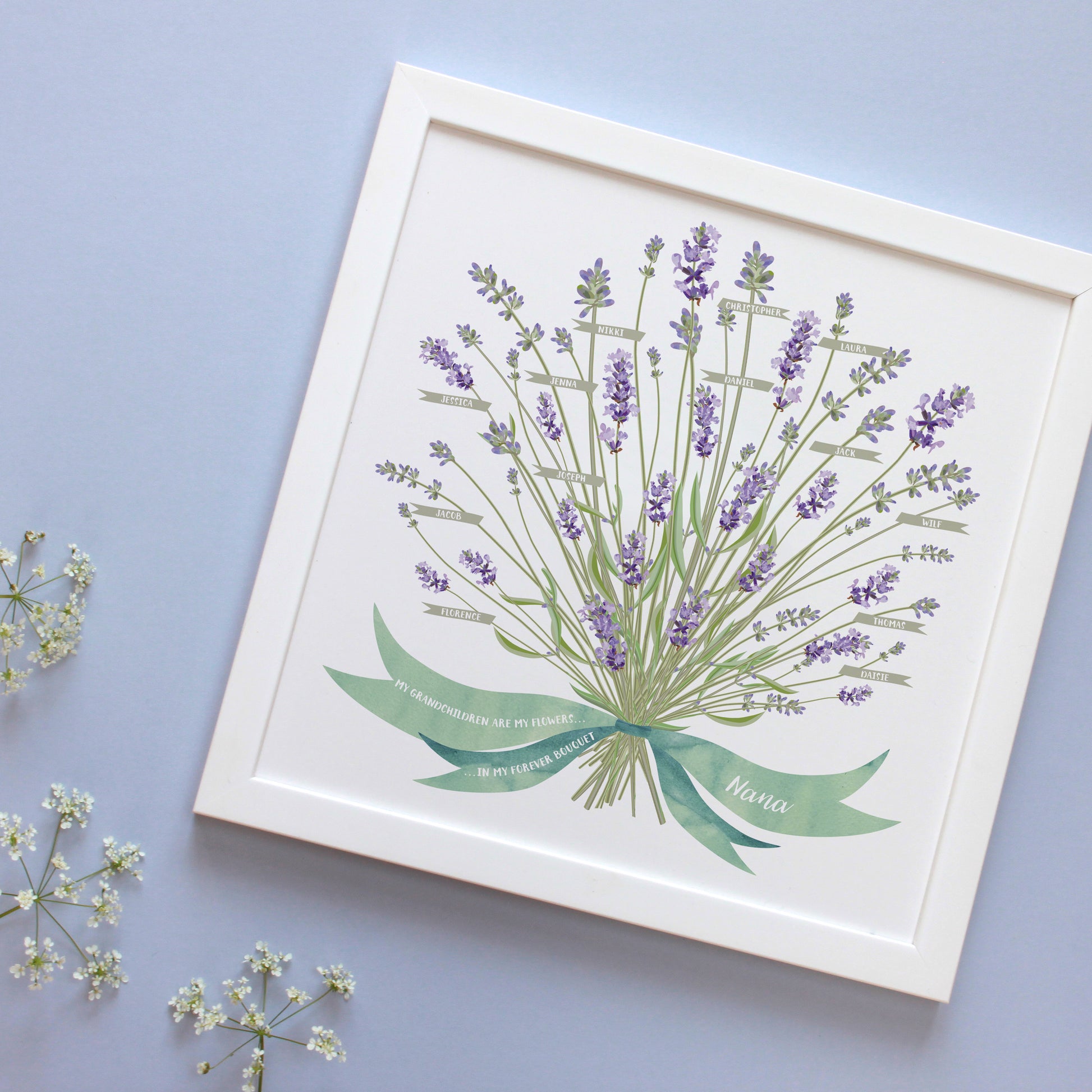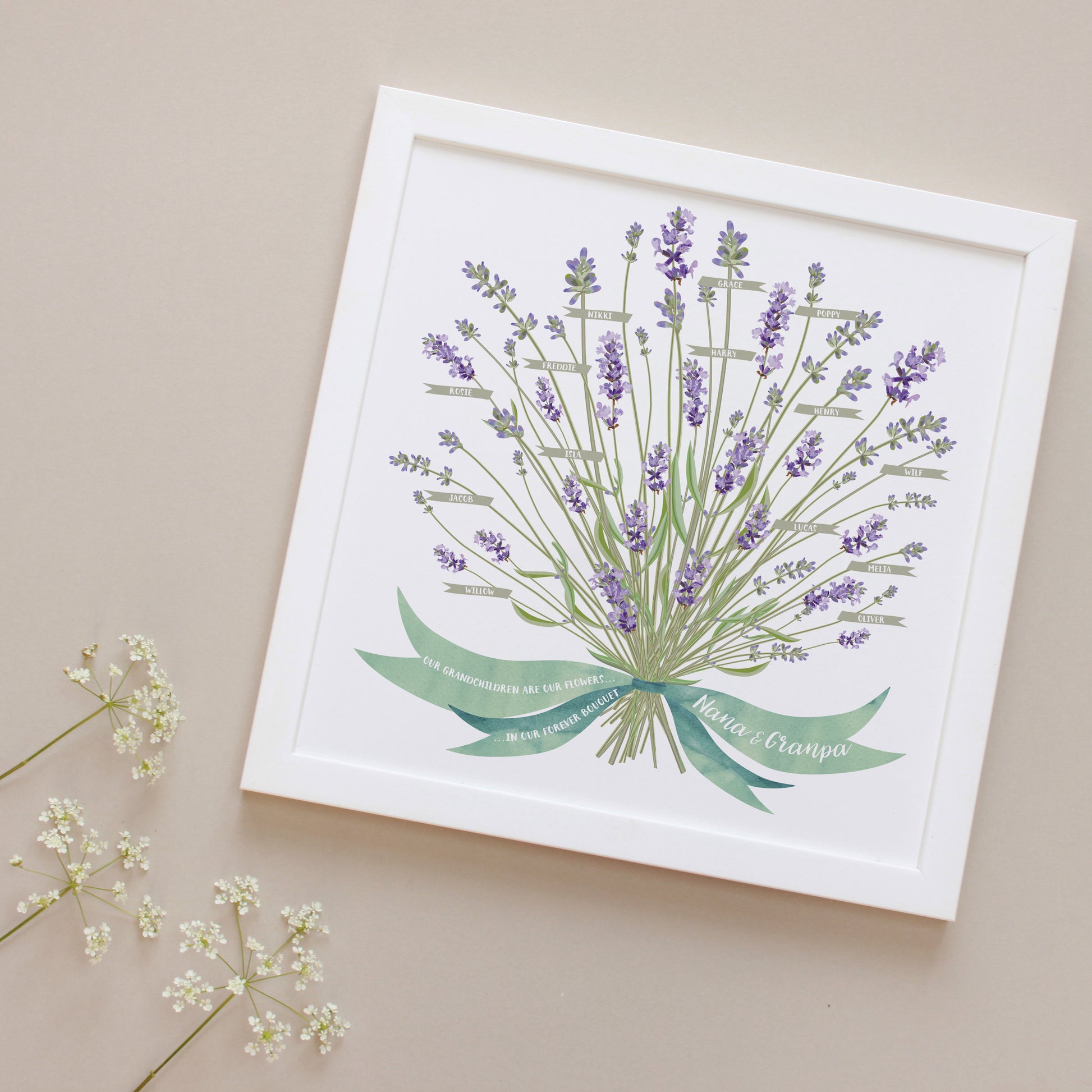 This beautiful lavender bouquet features the love filled message 'Our grandchildren are our flowers in our forever bouquet' on the curvy watercolour ribbon at the bottom of the print. The bouquet is comprised of delicately illustrated lavender sprigs and leaves. You can choose to have from 1 grandchild up to 15 grandchildren on small green coloured tags. The recipients name or names will be on the right side of the ribbon, it could be for Nanny, Nana, Nan, Grandad, or from Nanny and Grandad. Perfect to proudly display in their home.