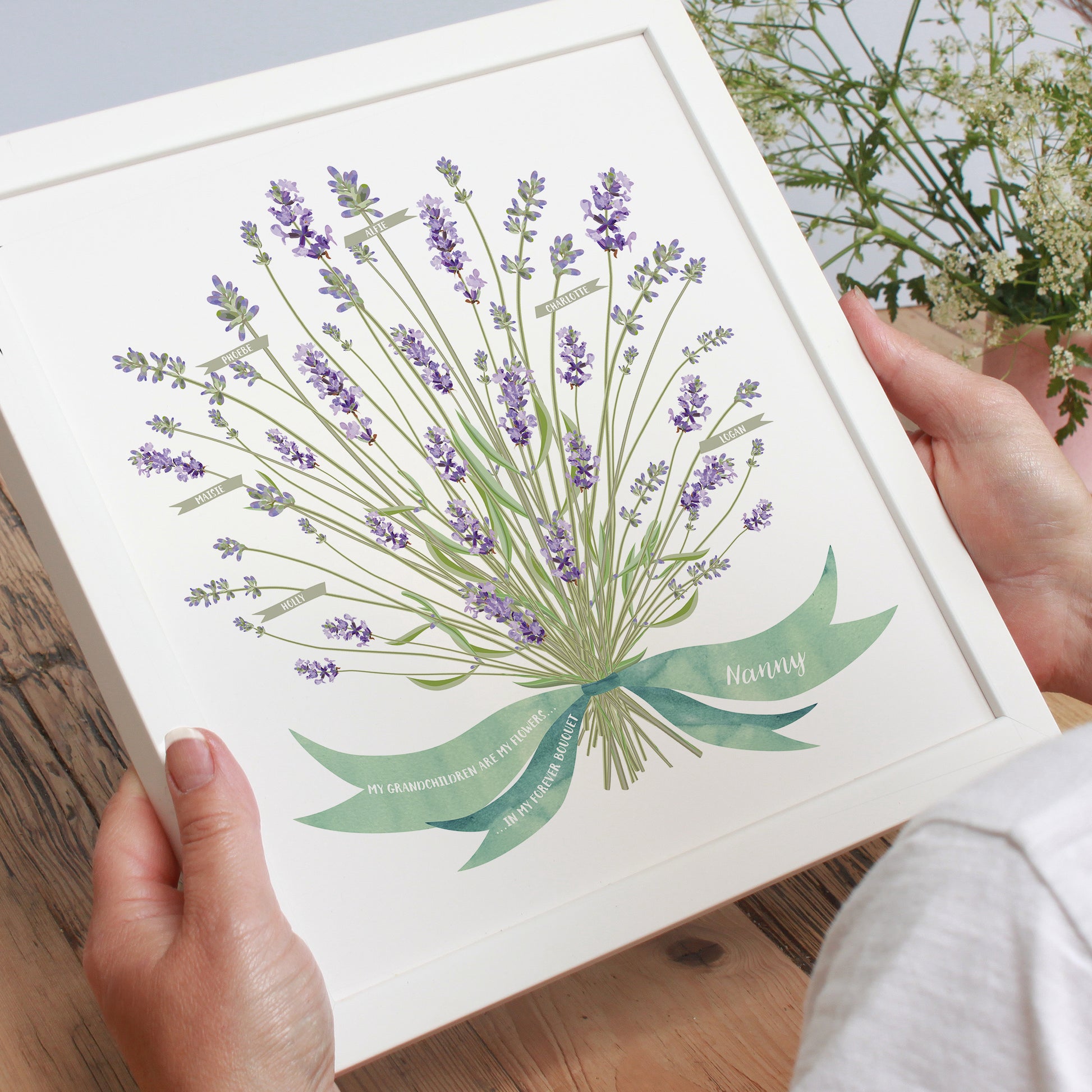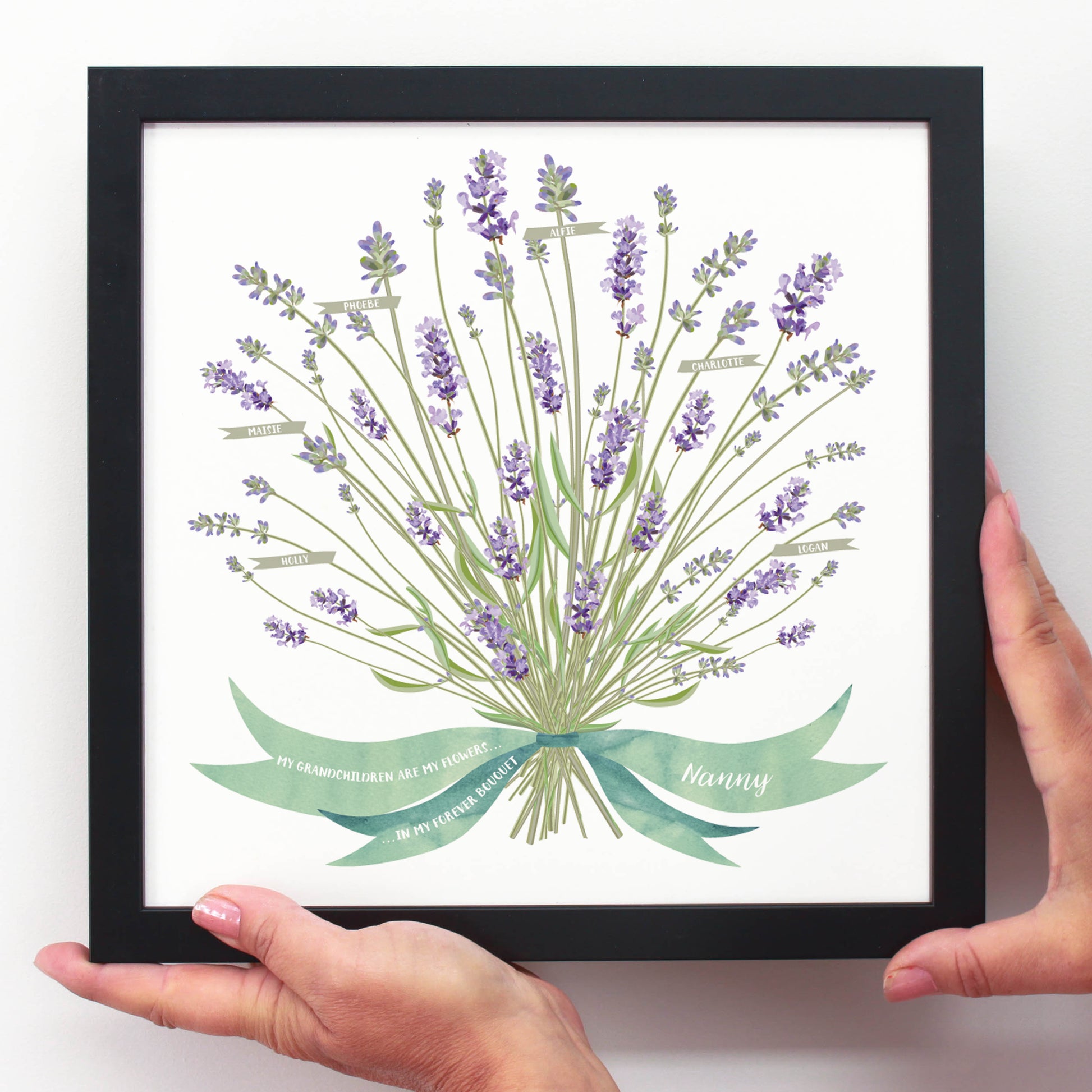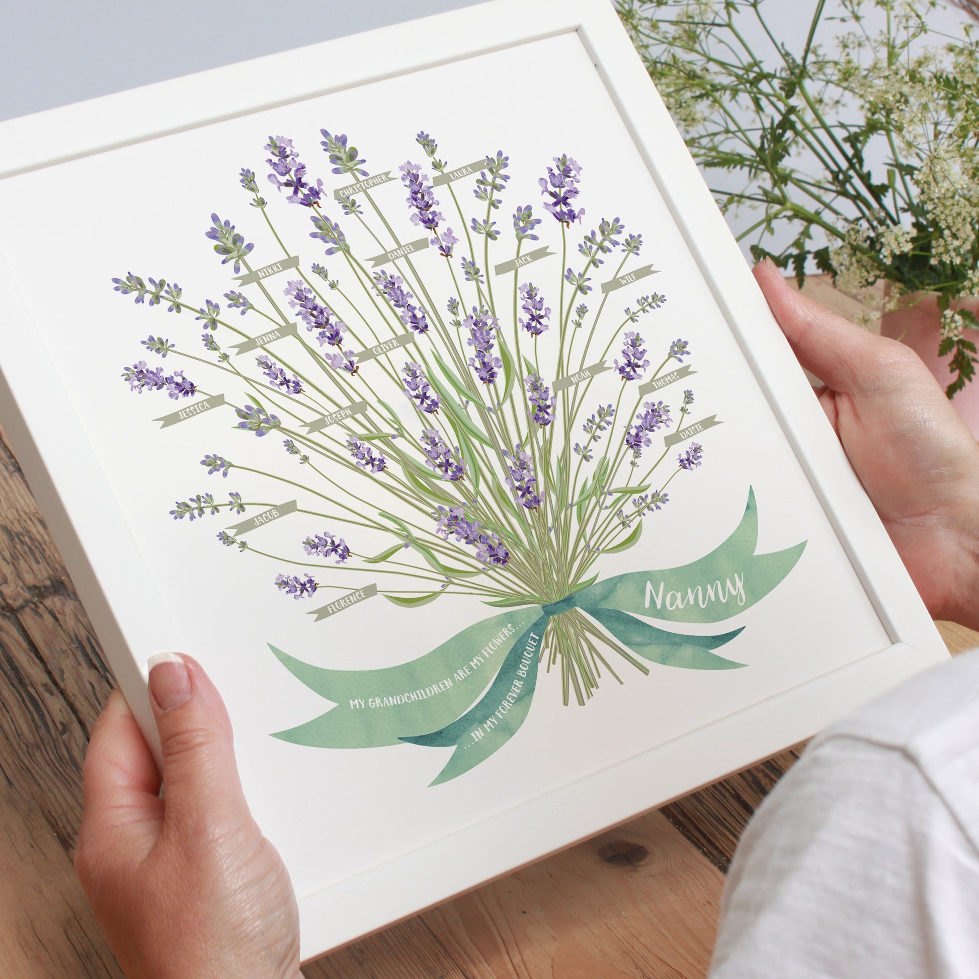 This beautiful lavender bouquet features the love filled message 'Our grandchildren are our flowers in our forever bouquet' on the curvy watercolour ribbon at the bottom of the print. The bouquet is comprised of delicately illustrated lavender sprigs and leaves. You can choose to have from 1 grandchild up to 15 grandchildren on small green coloured tags. The recipients name or names will be on the right side of the ribbon, it could be for Nanny, Nana, Nan, Grandad, or from Nanny and Grandad. Perfect to proudly display in their home.