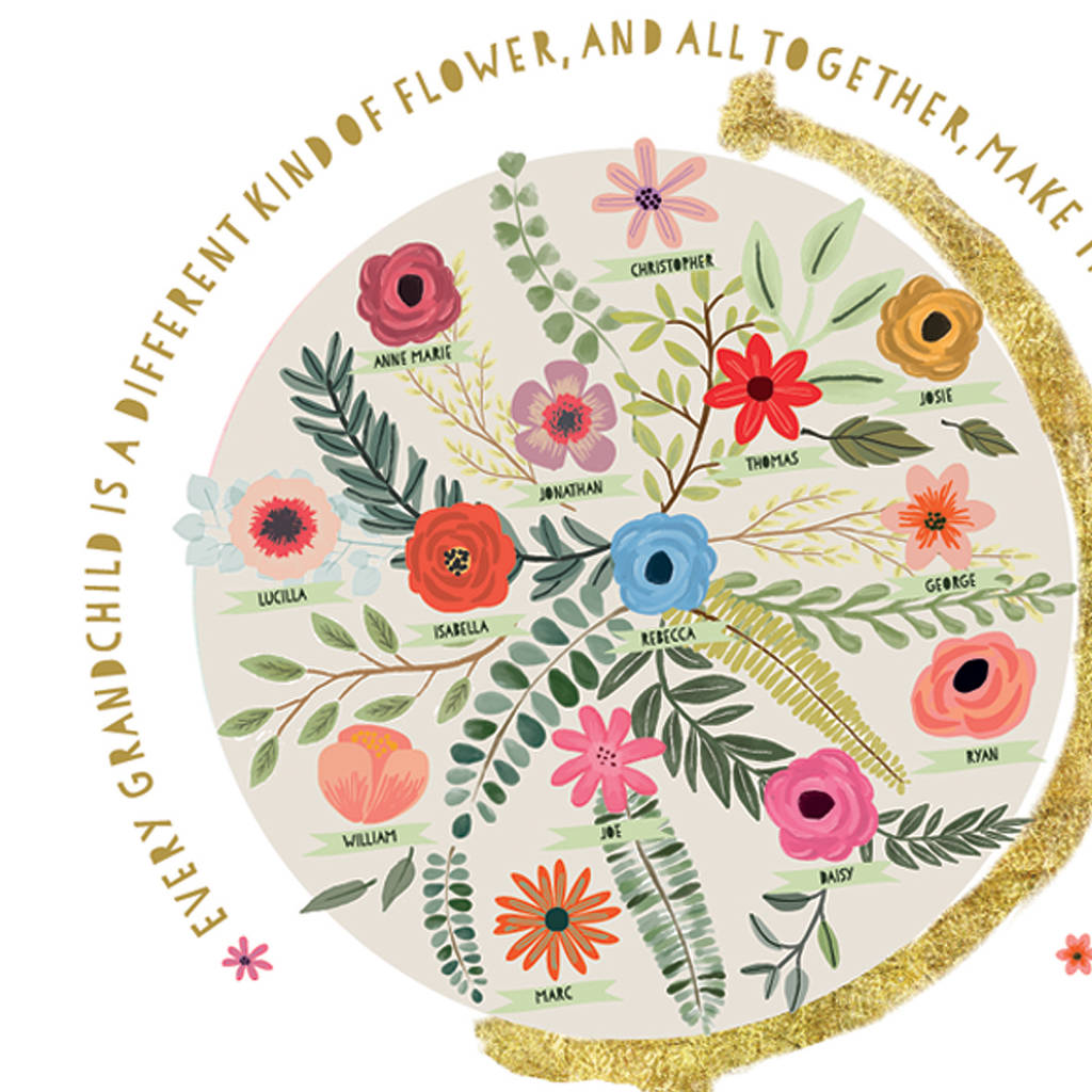 Treat your Nanny, Nan or Nana to a unique gift for a Birthday or Mothers Day. This simplistic illustration of a world globe has the wonderful quote 'Every grandchild is a different kind of flower, and all together, make this world, a beautiful garden.' wrapped around it. There are 14 different drawings of flowers and leaves on the globe making a beautiful garden. Each flower can feature a grandchild's name underneath each flower (up to 14).