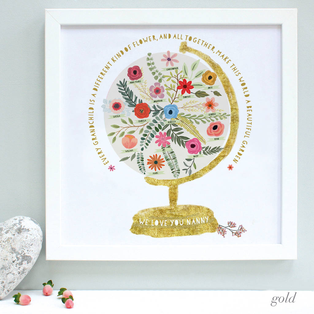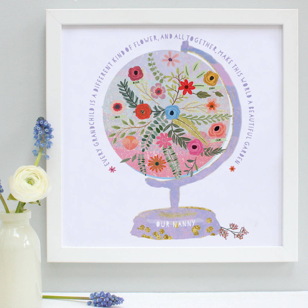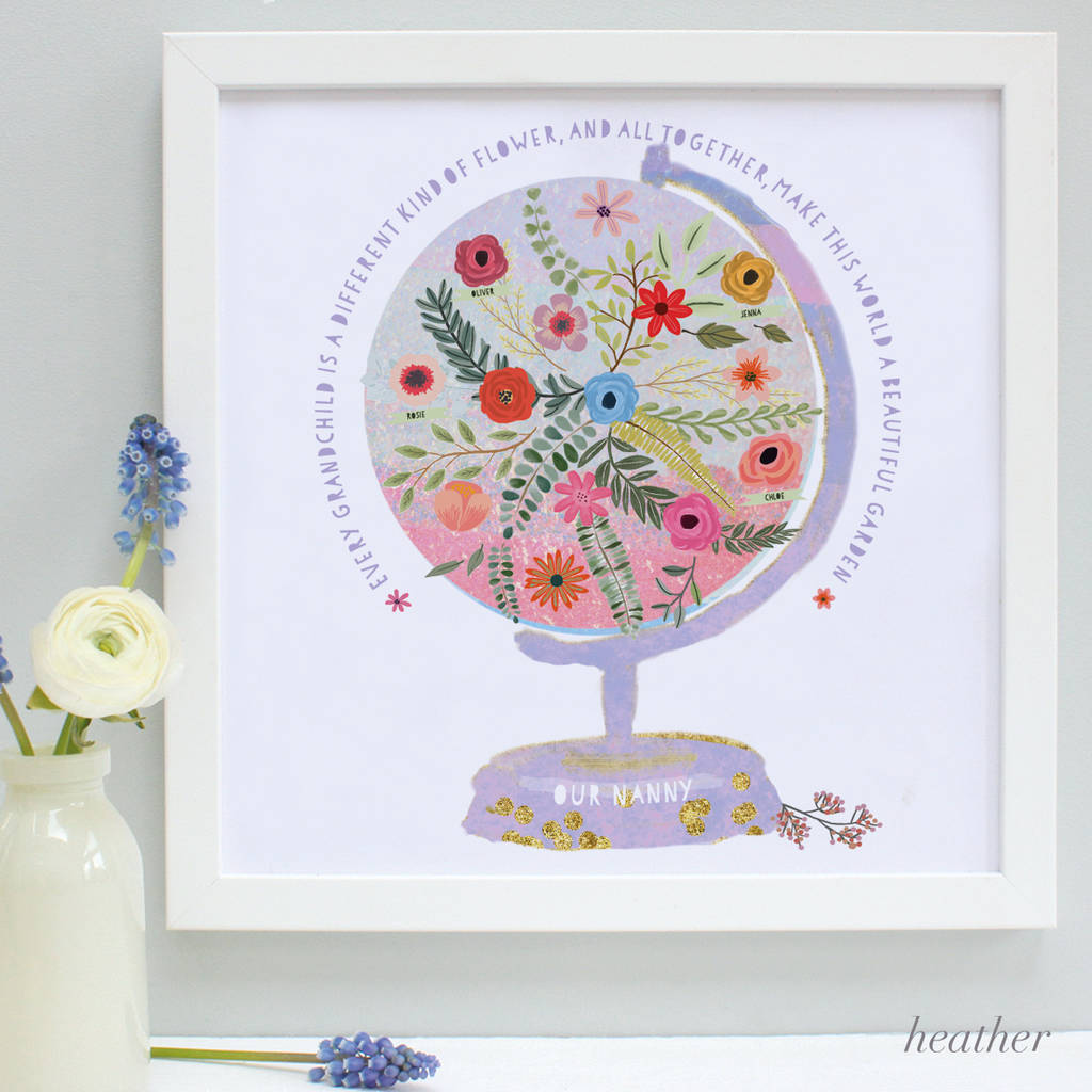 Make your Nanny feel extra special with this beautiful print featuring a lovely world globe illustration with the names of grandchildren and sentimental quote.