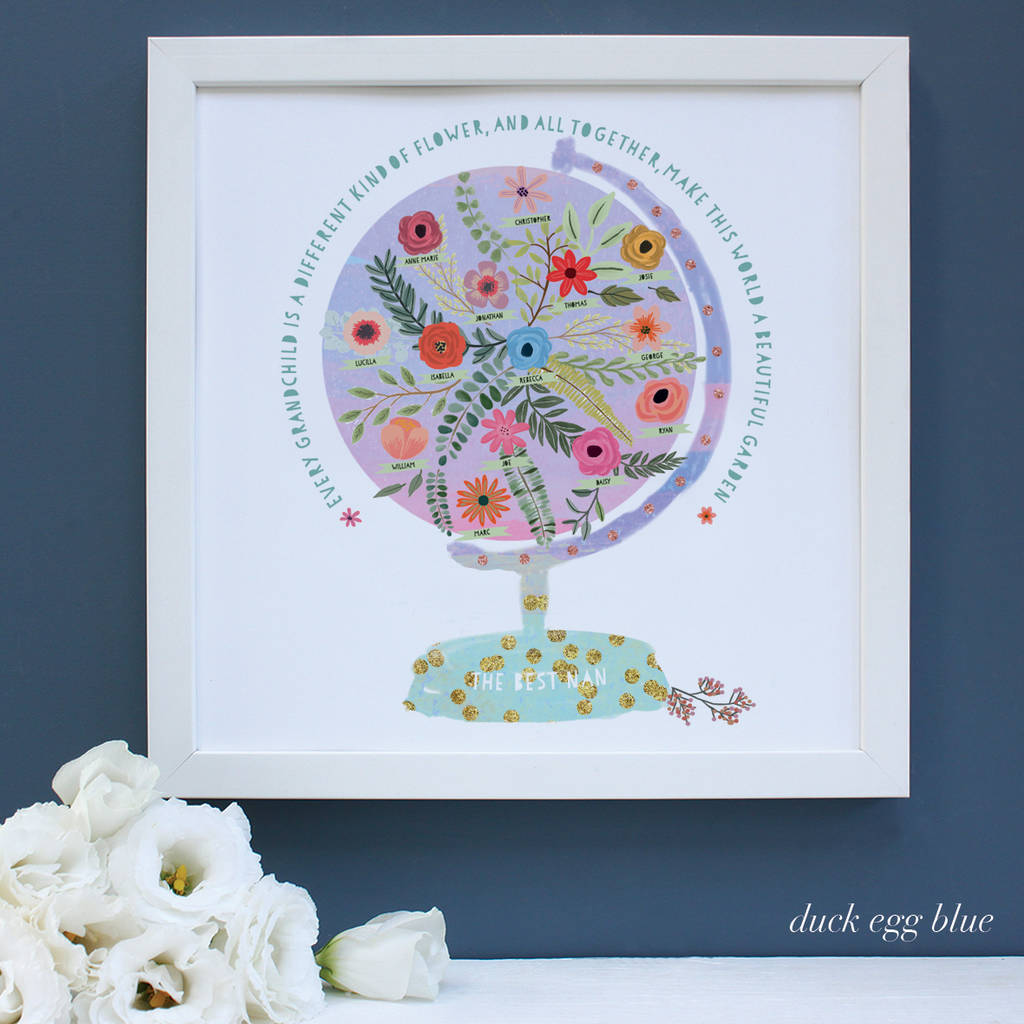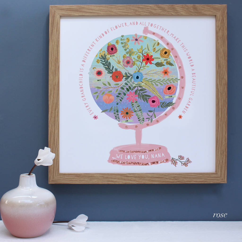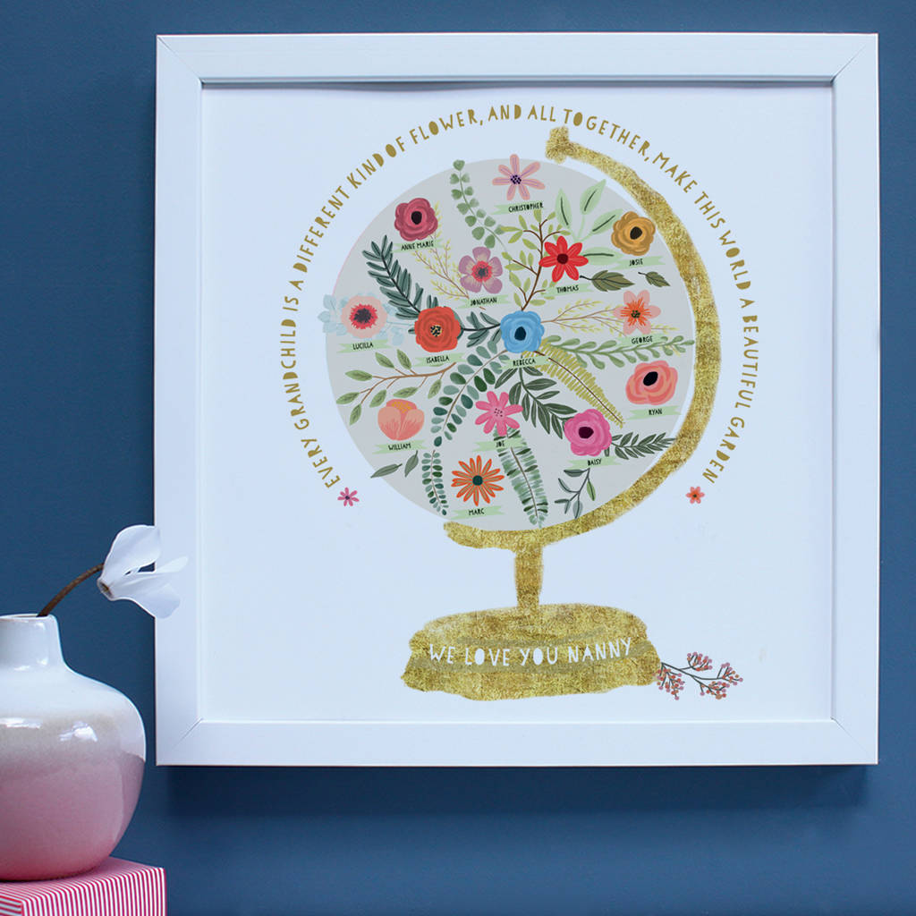 Make your Nanny feel extra special with this beautiful print featuring a lovely world globe illustration with the names of grandchildren and sentimental quote.