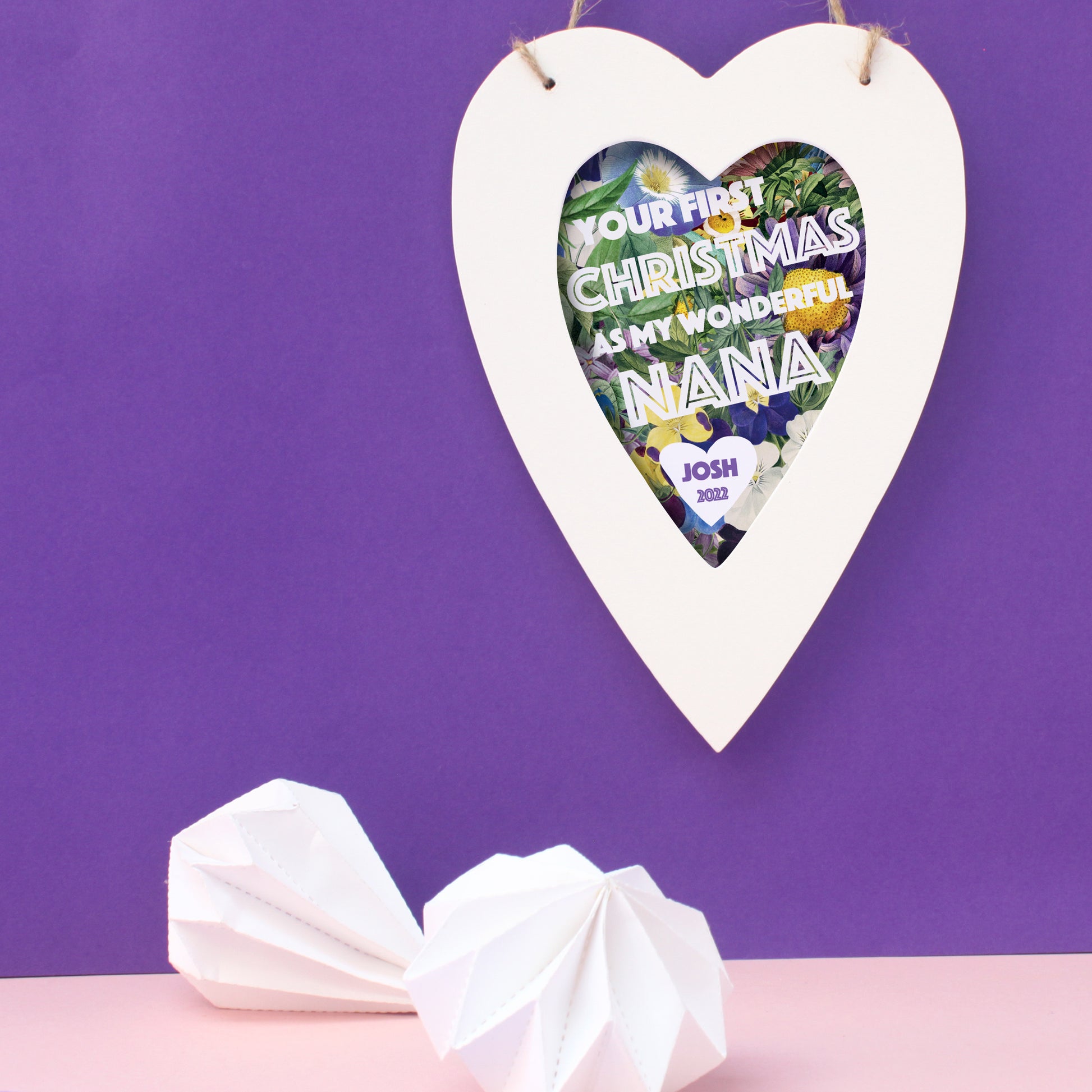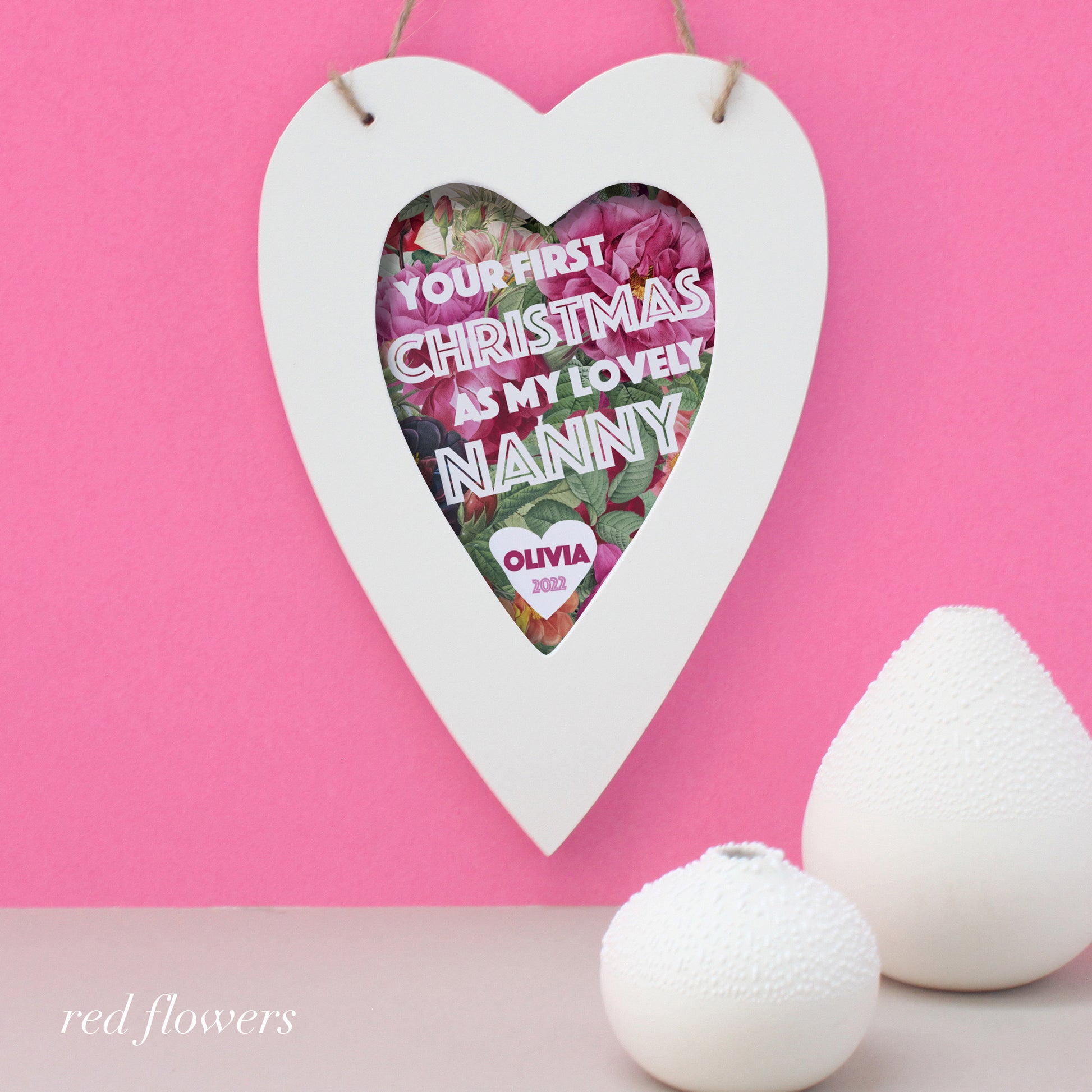 A lovely framed heart for the first Christmas as a Grandmother, this framed print has white lettering with a choice of 3 different coloured vintage flower backgrounds and a large heart at the bottom for the baby's name.