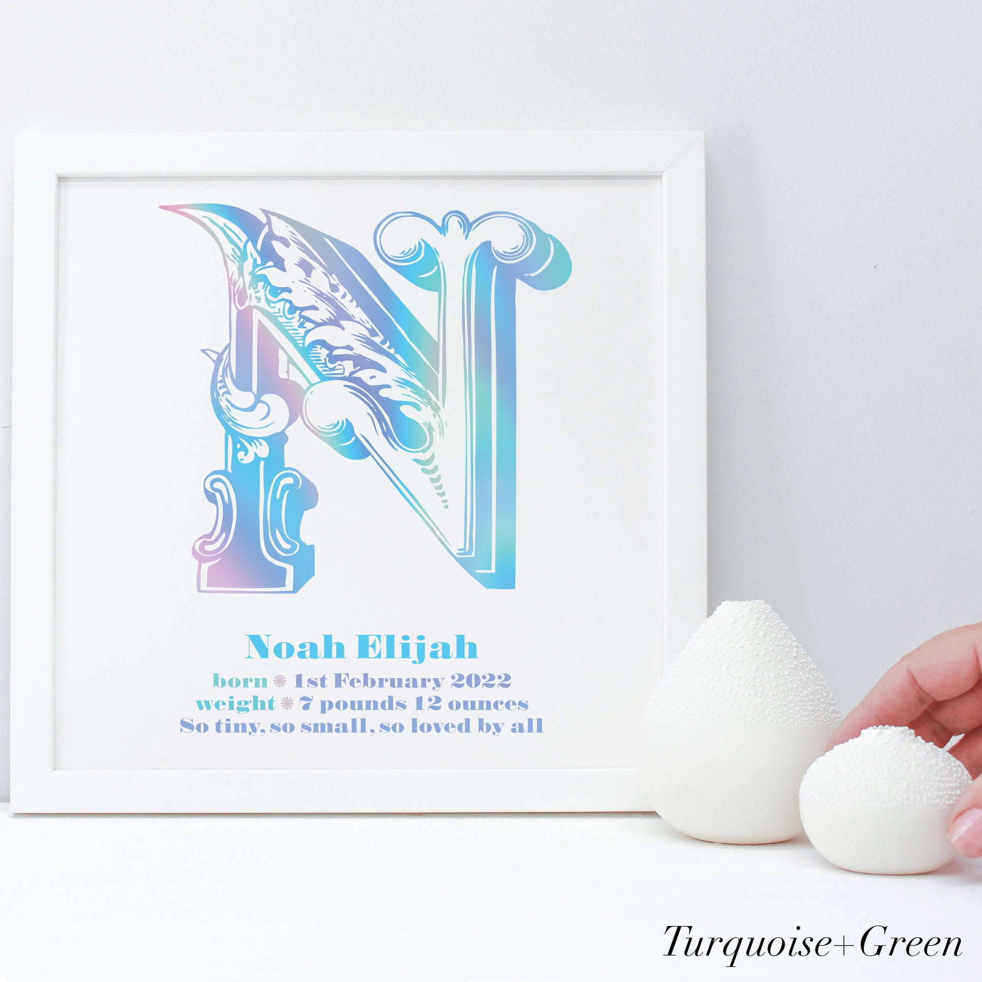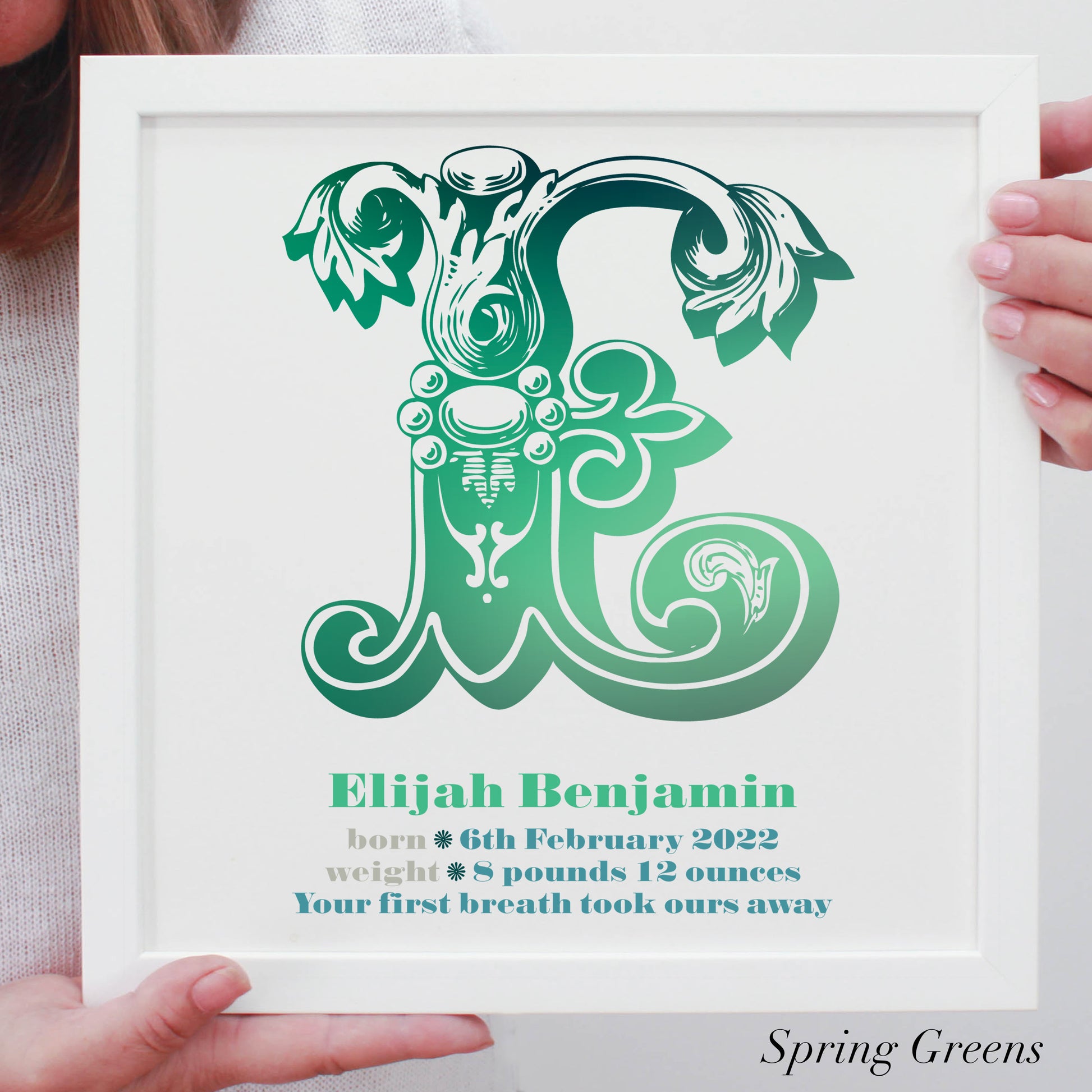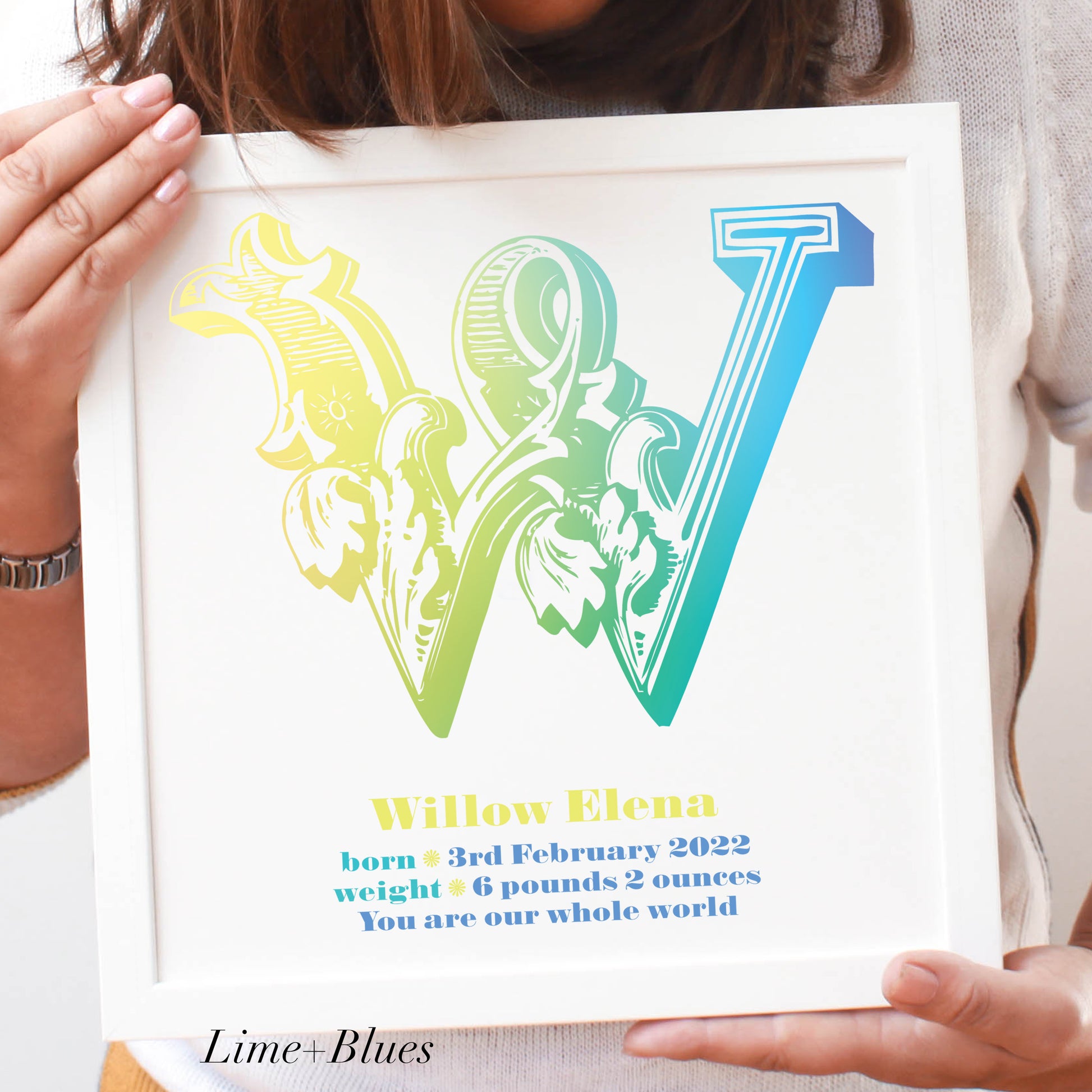 These fun initials celebrate the arrival of a New Baby, each letter is totally unique, merging Victorian and modern typography together. A graduated colour is then applied to each letter (six colourway options), making each finished print bespoke to each New Baby. You can add a date, weight and short message at the bottom displayed in bold lettering in colours to complement the main initial.