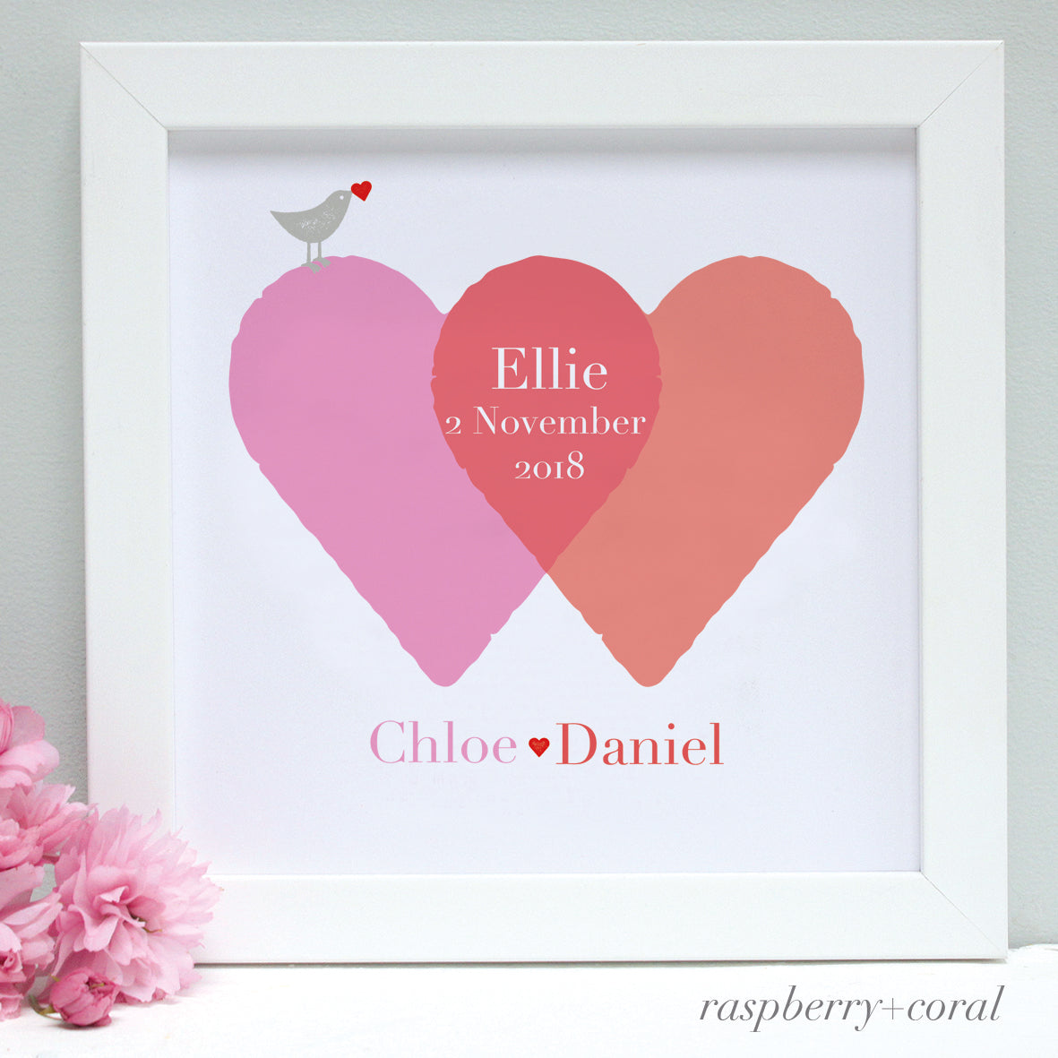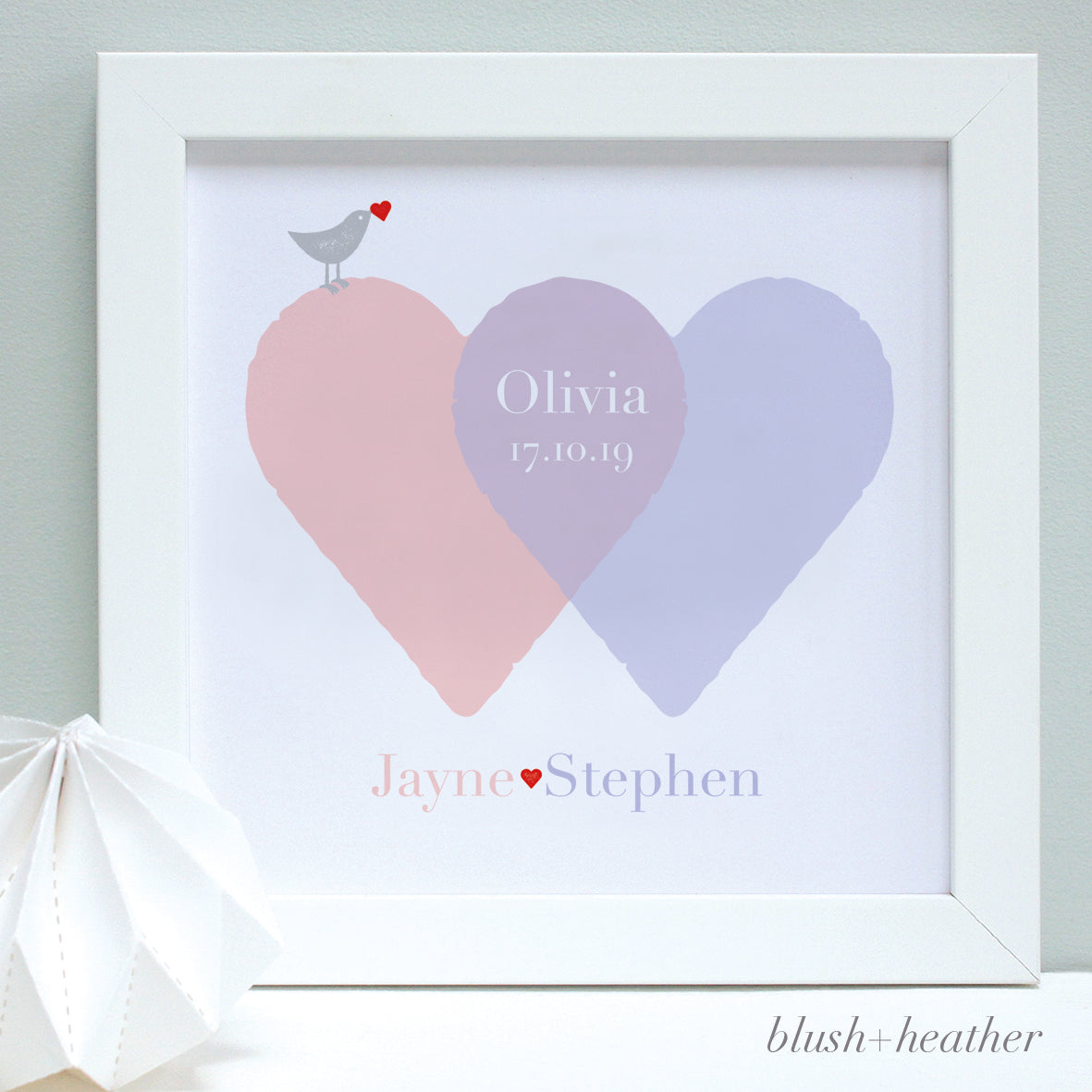 A modern personalised framed print which features two overlapping parent hearts to create the new baby, perfect to celebrate the arrival of a new baby. Perfect for the fresh, minimal nursery.