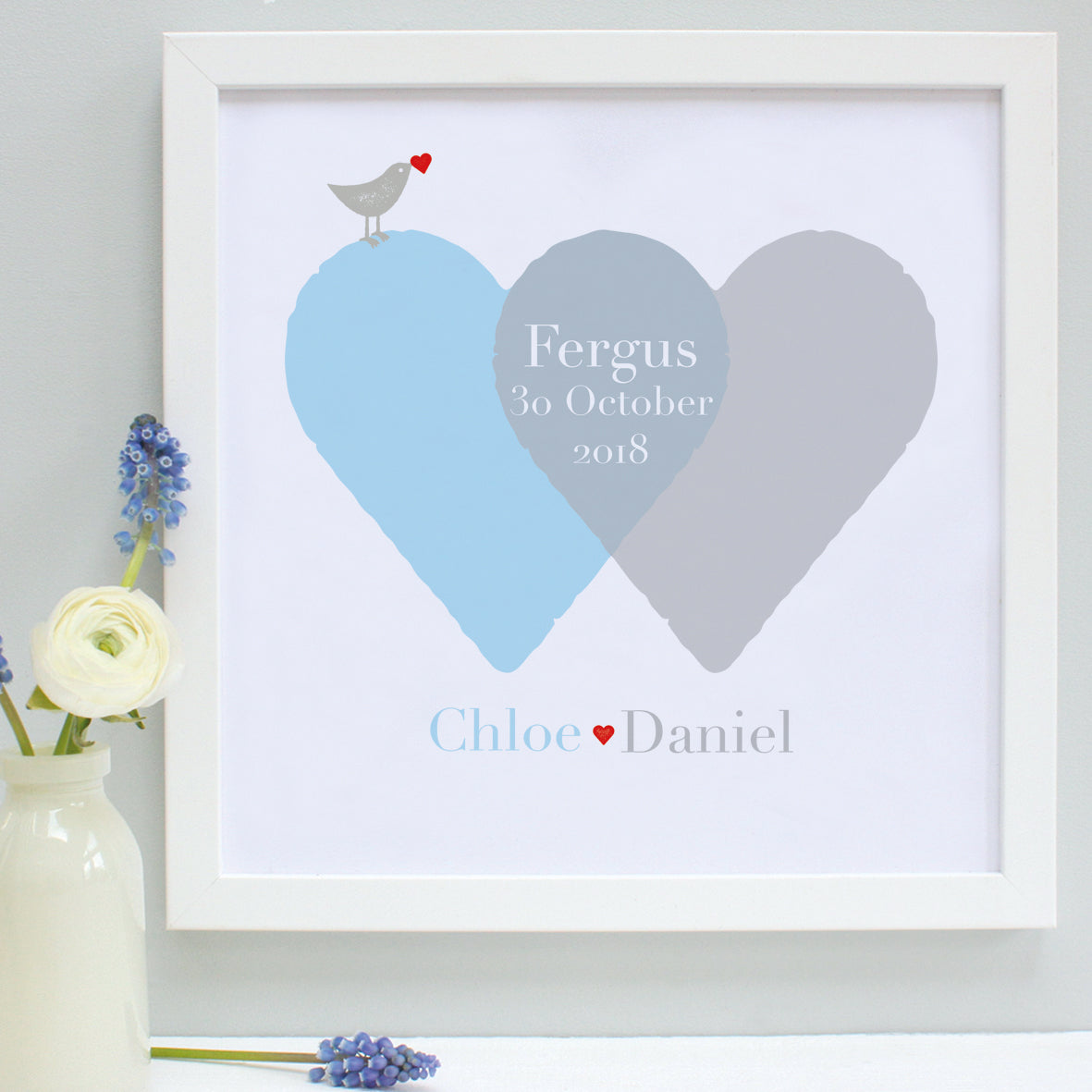 This beautiful framed print would be perfect for new parents or for Christening or Naming Days. It has two hearts which overlap to create another colourway, you can choose a combination of 12 colours to create a unique print. You can add a baby's name and date of birth in the overlap of hearts.