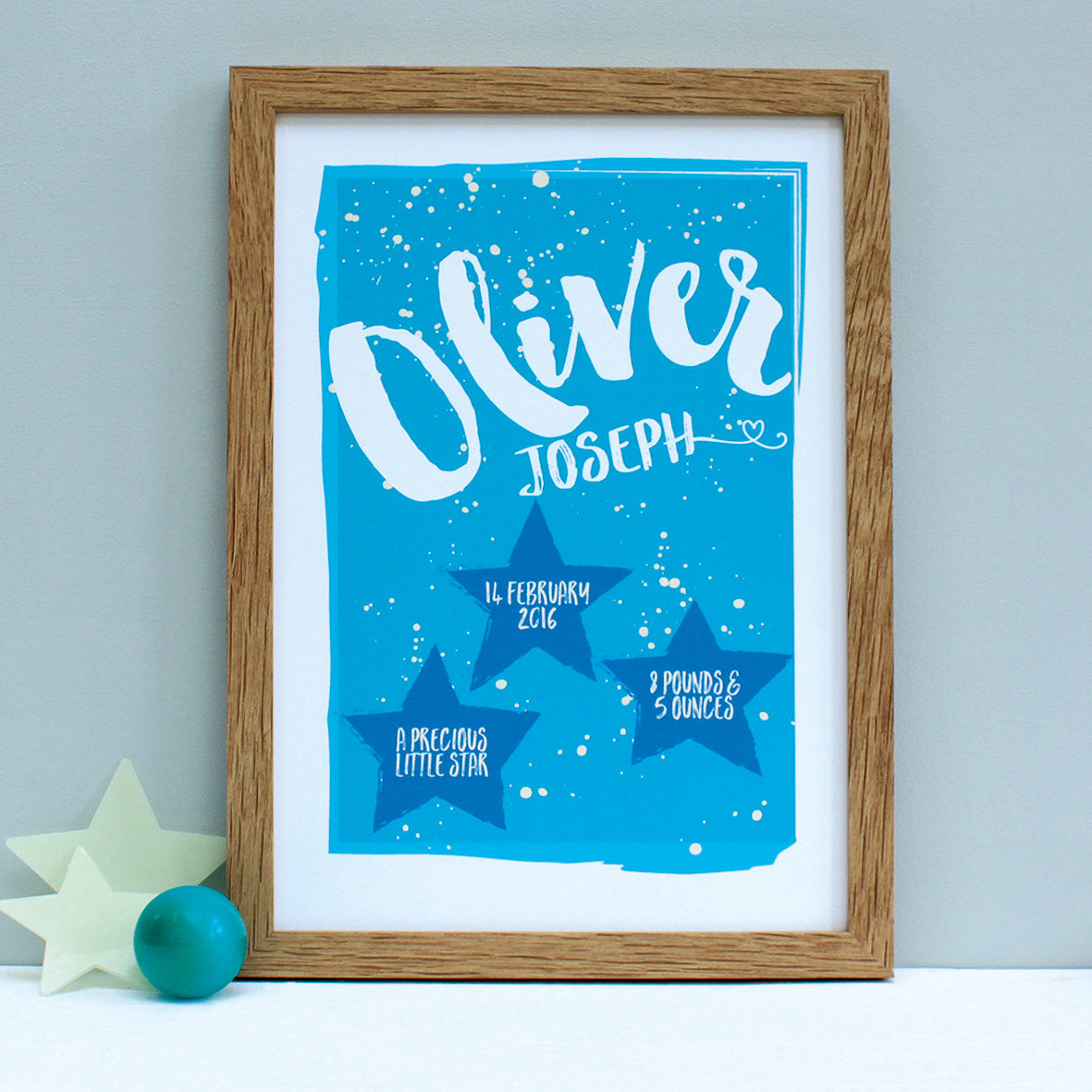 This beautiful framed print features 'painterly' typography on a starry background, the stars are made from splodges of paint to create energy and movement. There are three painted stars containing date and weight of birth and also the opportunity to add a short message in the third star. There is a painted unstructured border to the background and we have added a little heart to the middle name. A perfect personalised reminder of a baby's arrival and will look beautiful in the modern nursery.