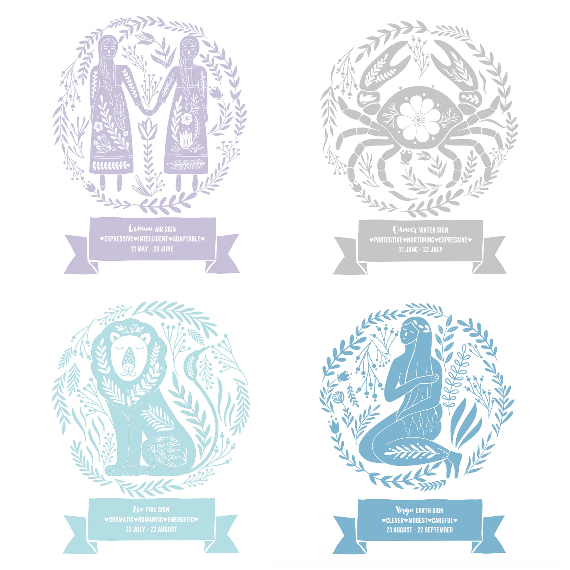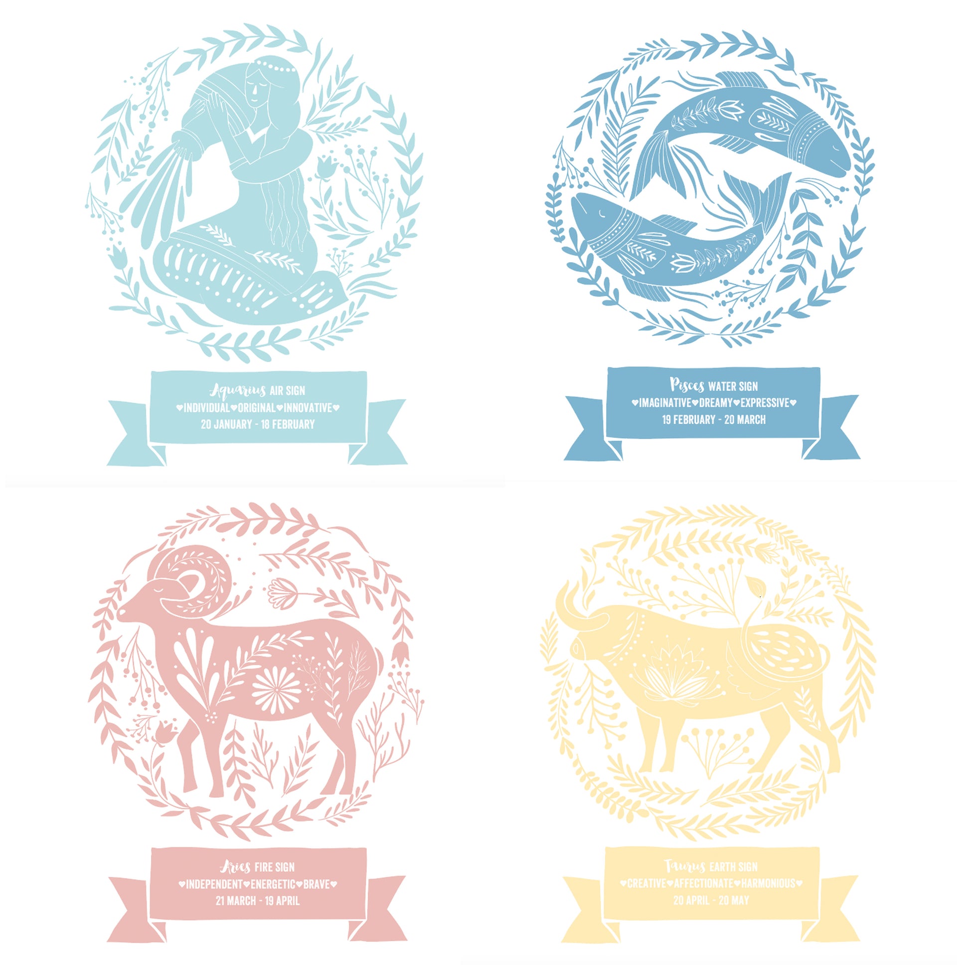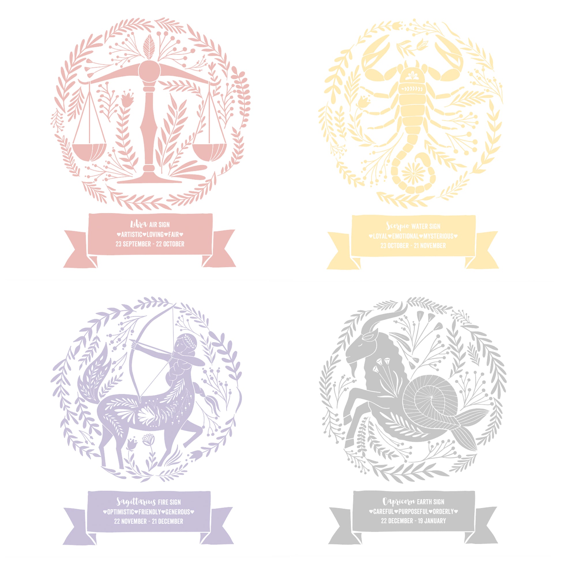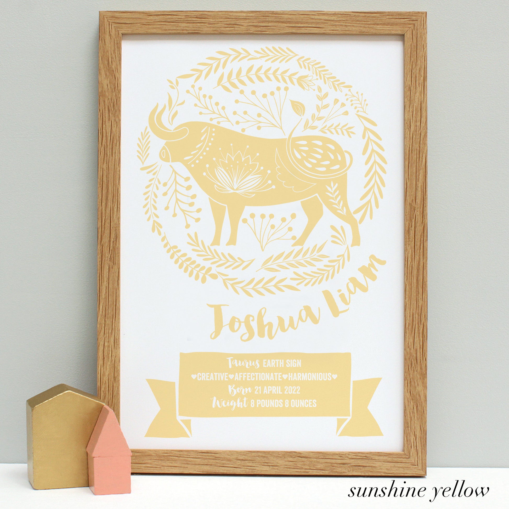 These graphic zodiac illustrations come in a choice of 6 colour options: blush, dove grey, sea green, heather, duck egg blue and sunshine yellow, but if there is a special colour you would prefer, we can change the colour for you. Perfect for a New Baby nursery or bedroom.