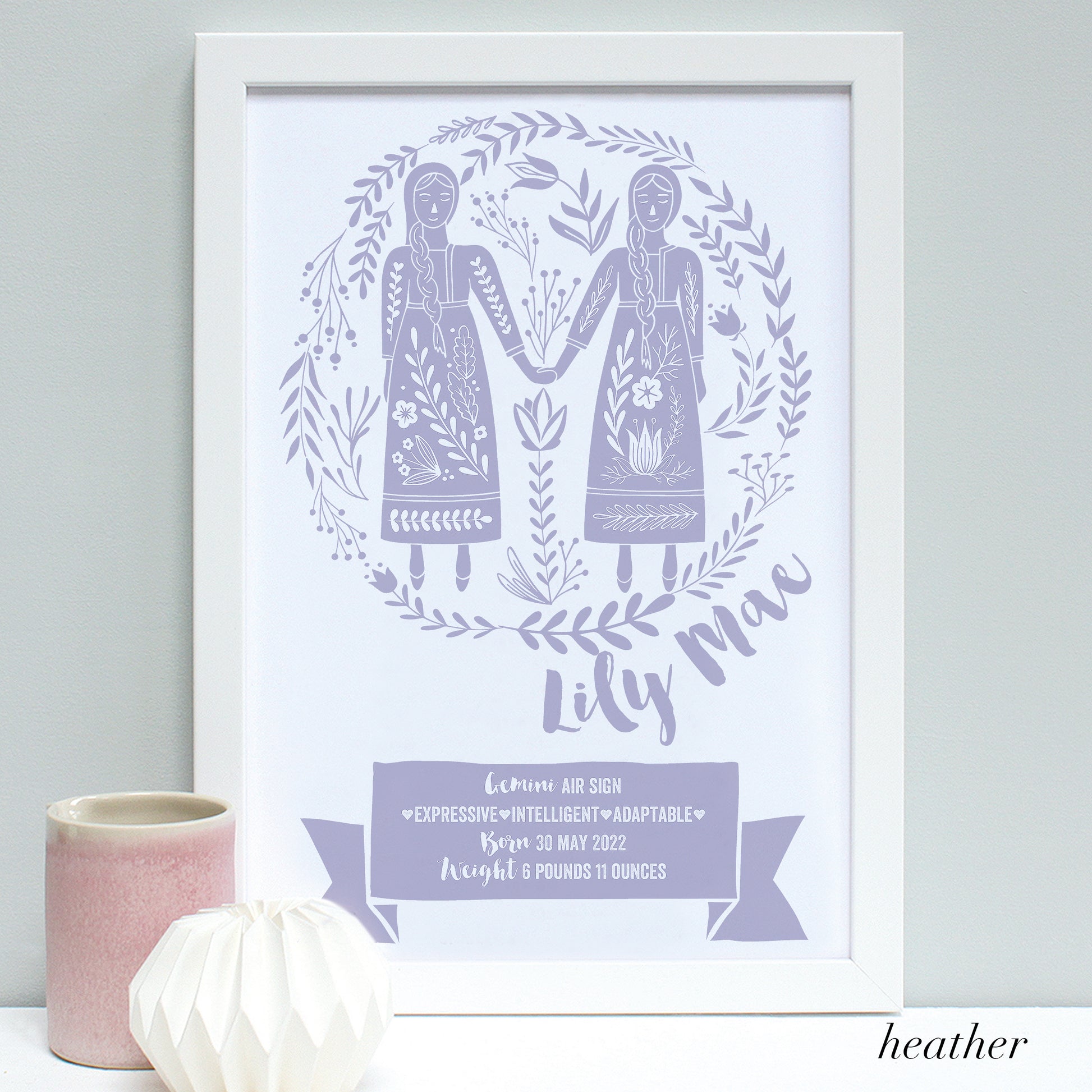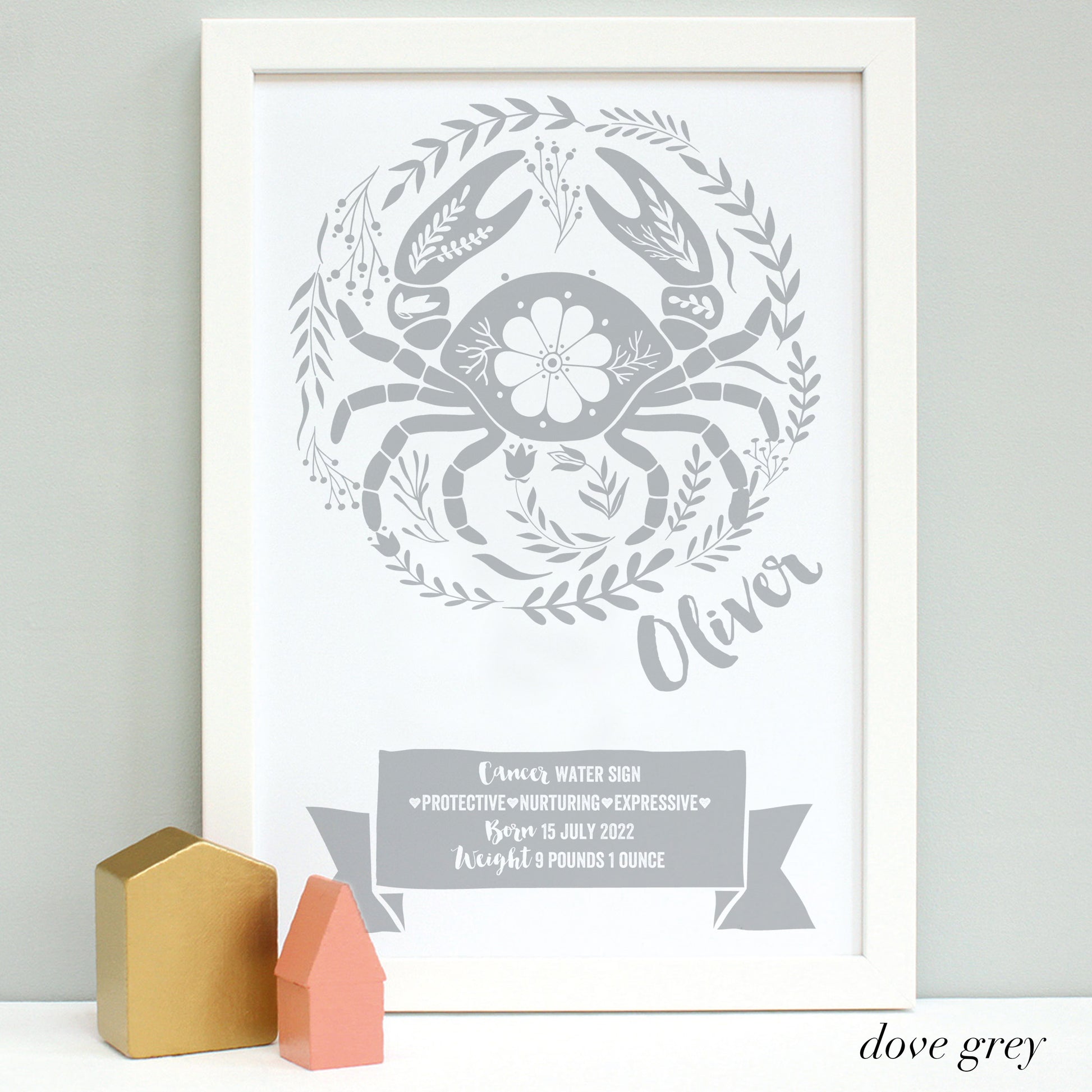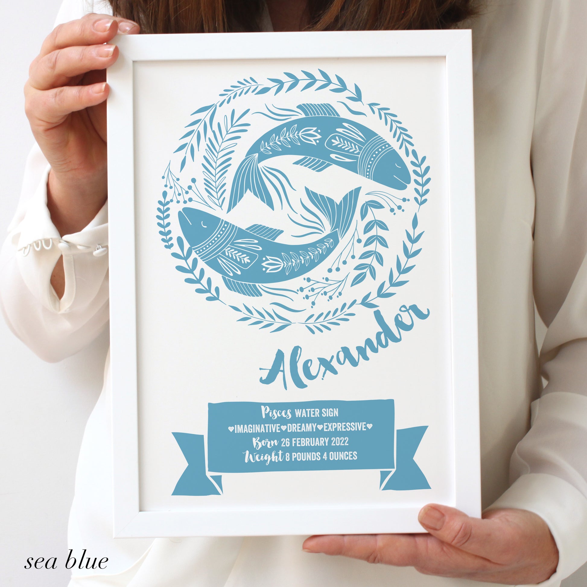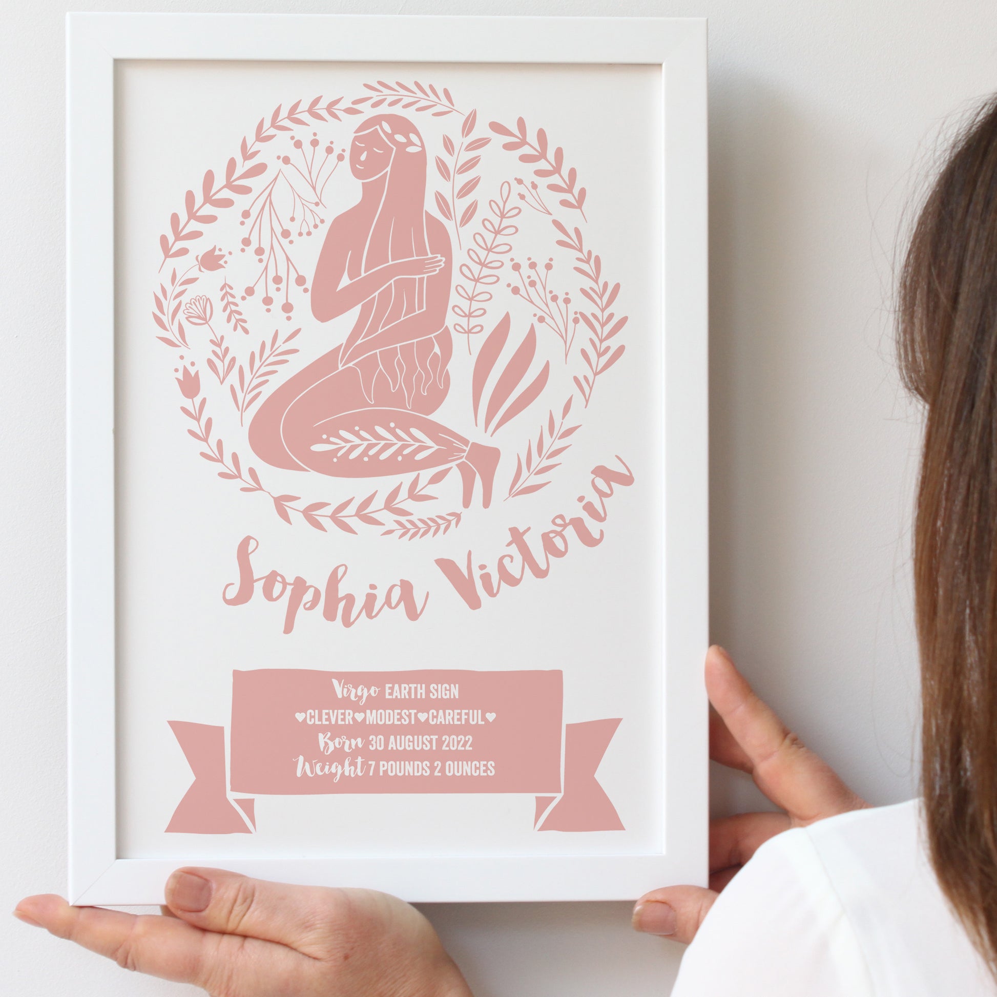 These graphic zodiac illustrations come in a choice of 6 colour options: blush, dove grey, sea green, heather, duck egg blue and sunshine yellow, but if there is a special colour you would prefer, we can change the colour for you. Perfect for a New Baby nursery or bedroom.