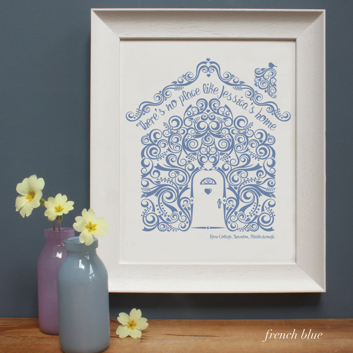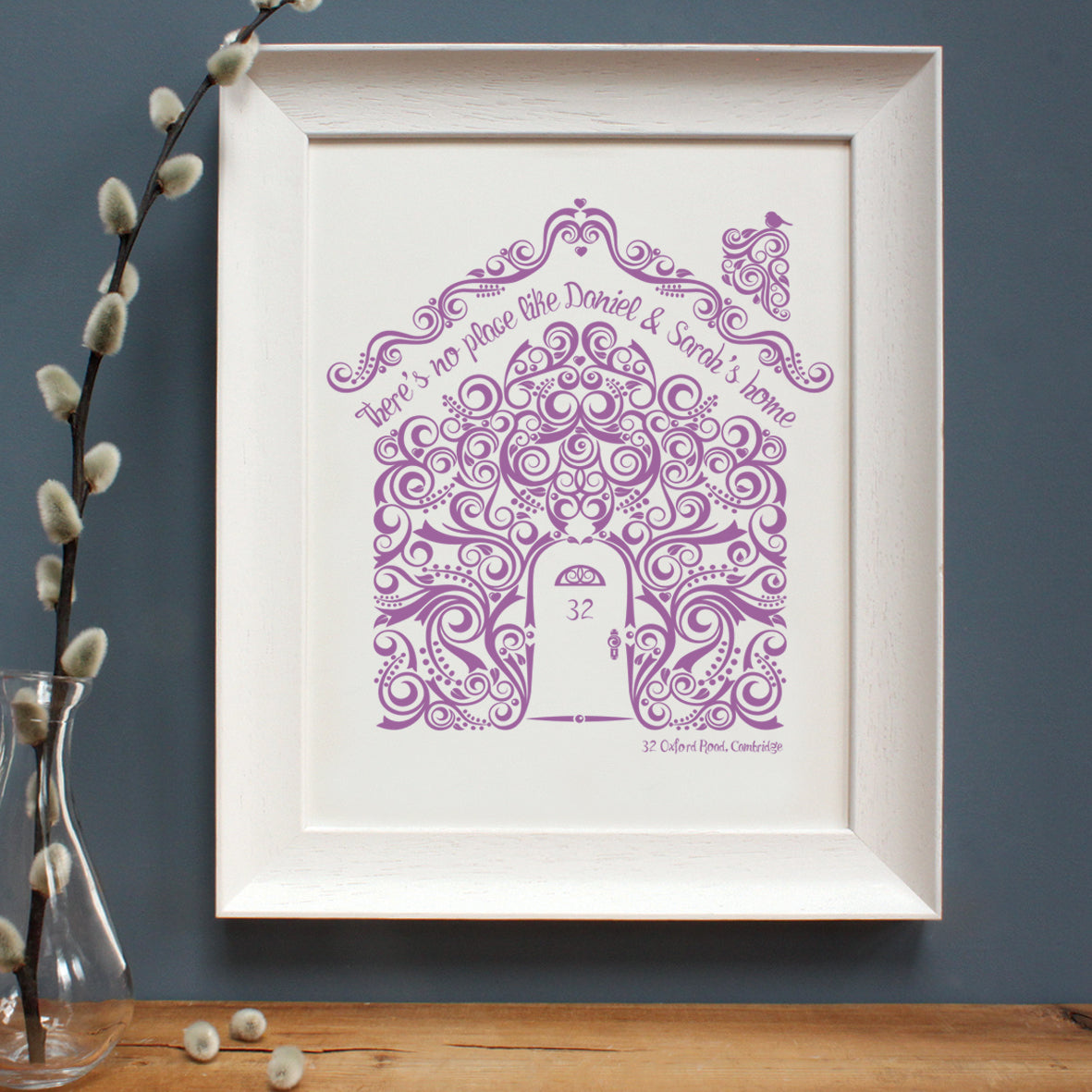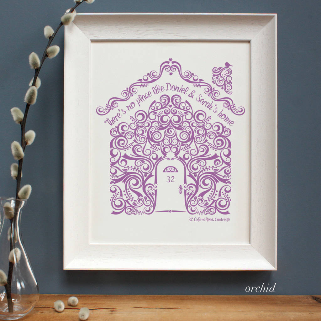 Simply supply us with all the occupants names which will feature in the 'There's no place like...' and address of the home which will feature at the bottom of the print, and the number or small heart on the door, you can include a postcode too. This framed print will look beautiful in the new home.
