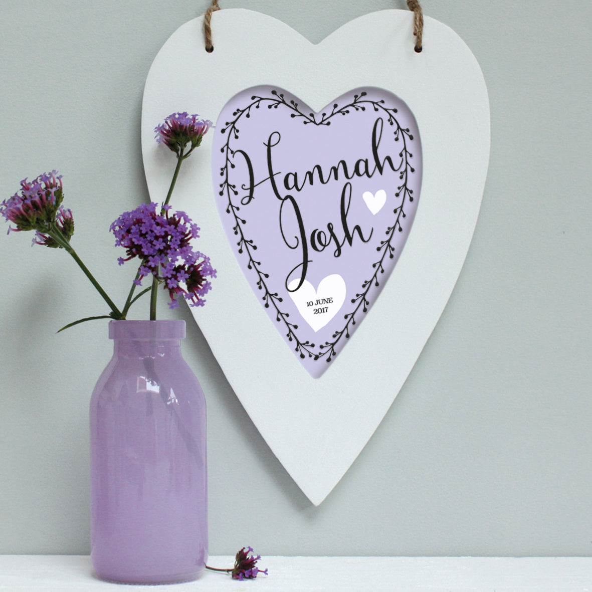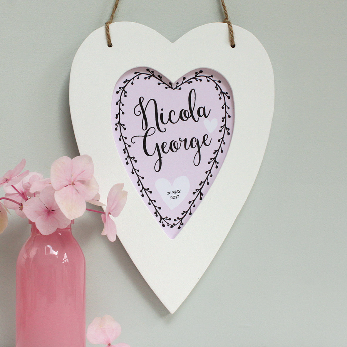 A beautiful framed heart print, naming the happy couple in black curvy lettering on a choice of pastel backgrounds, perfect for their special wedding day.