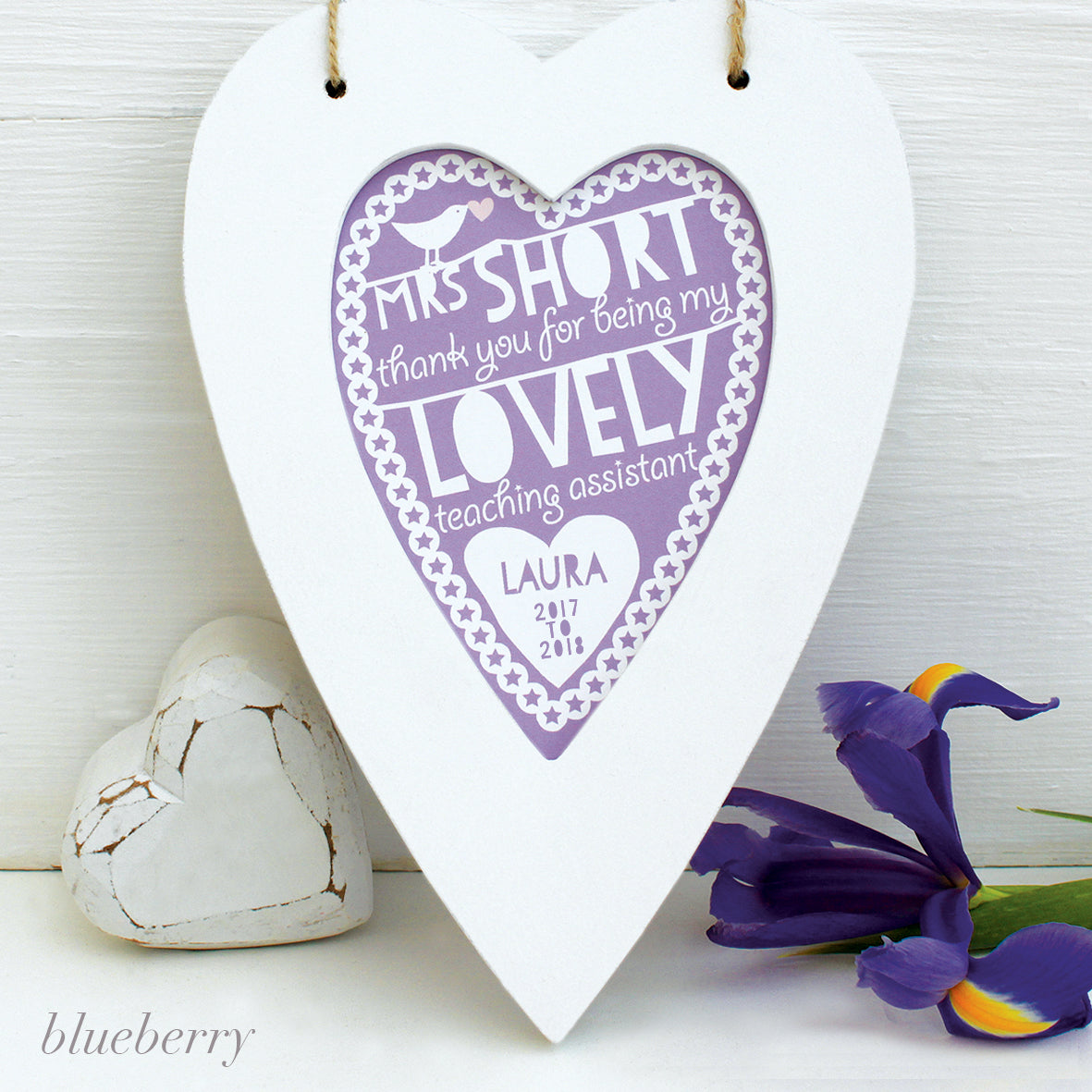 This print is contained in a matt painted white framed heart, there is a choice of daisy or star border around the print and white lettering on a choice of 12 different coloured backgrounds, and a little bird carrying a heart at the top.