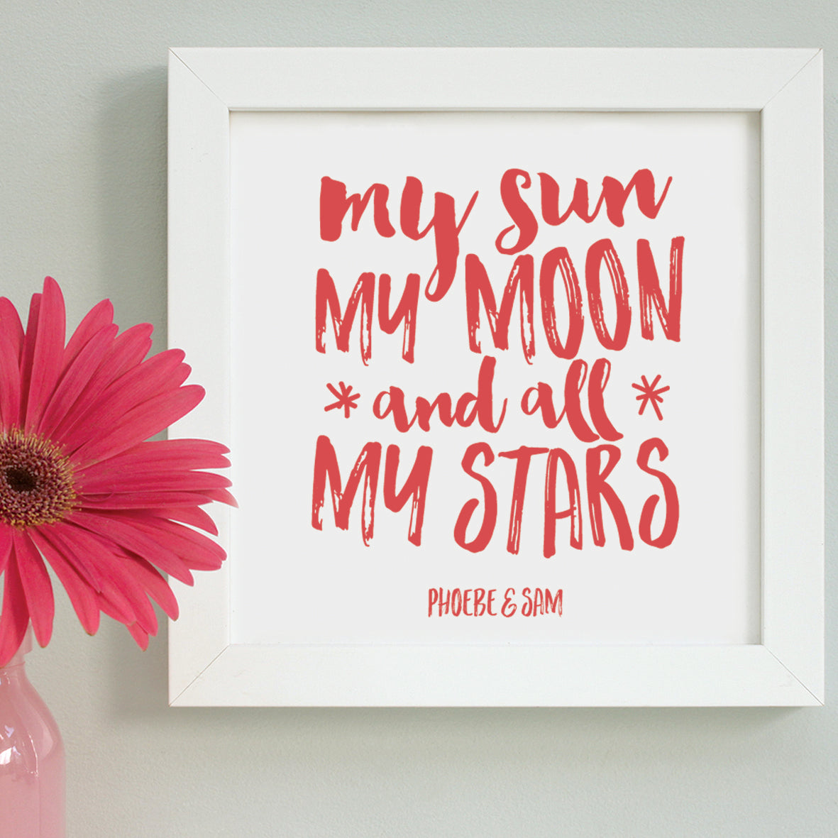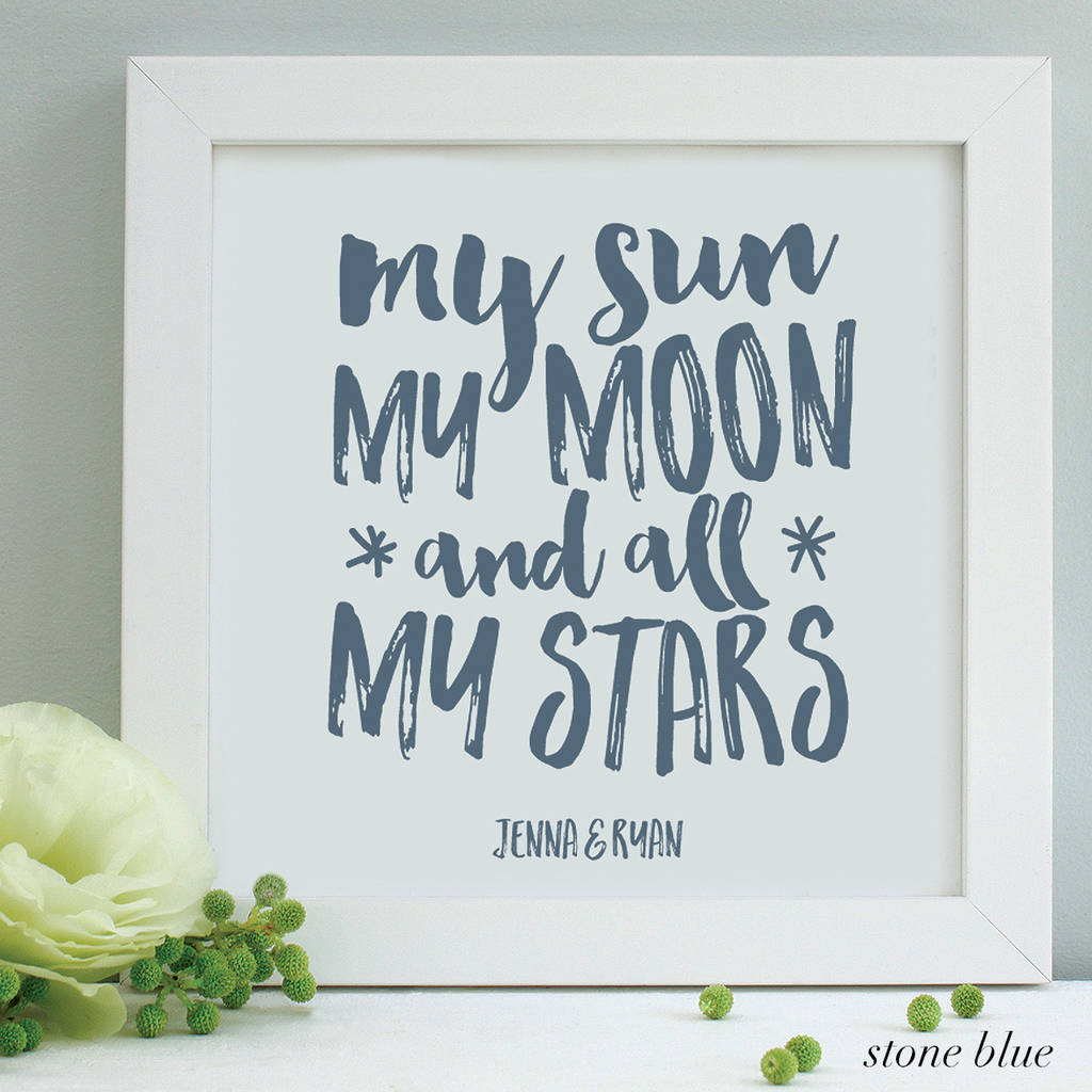 This personalised framed print, is a lasting reminder of your feelings to your loved one. The message 'my sun, my moon and all my stars' is displayed with an informal curvy script and embellished with small decorations. You can choose to have both of your names at the bottom of the print with an optional special date. You can choose from 7 different colours for the quotes: coral, black, blush, dove grey, stone blue, plum and blues. Perfect for Valentines Day or just when you need to express your true love!