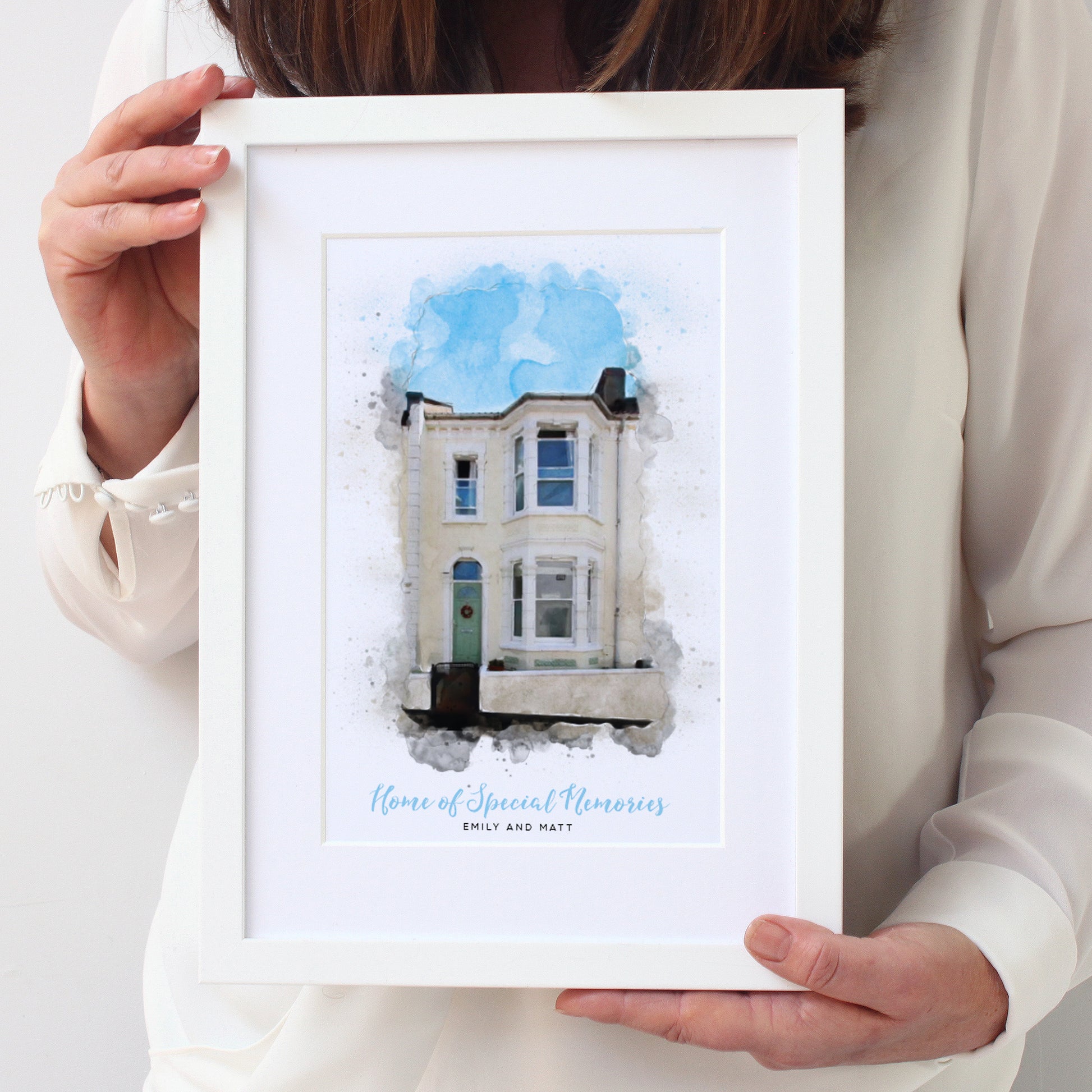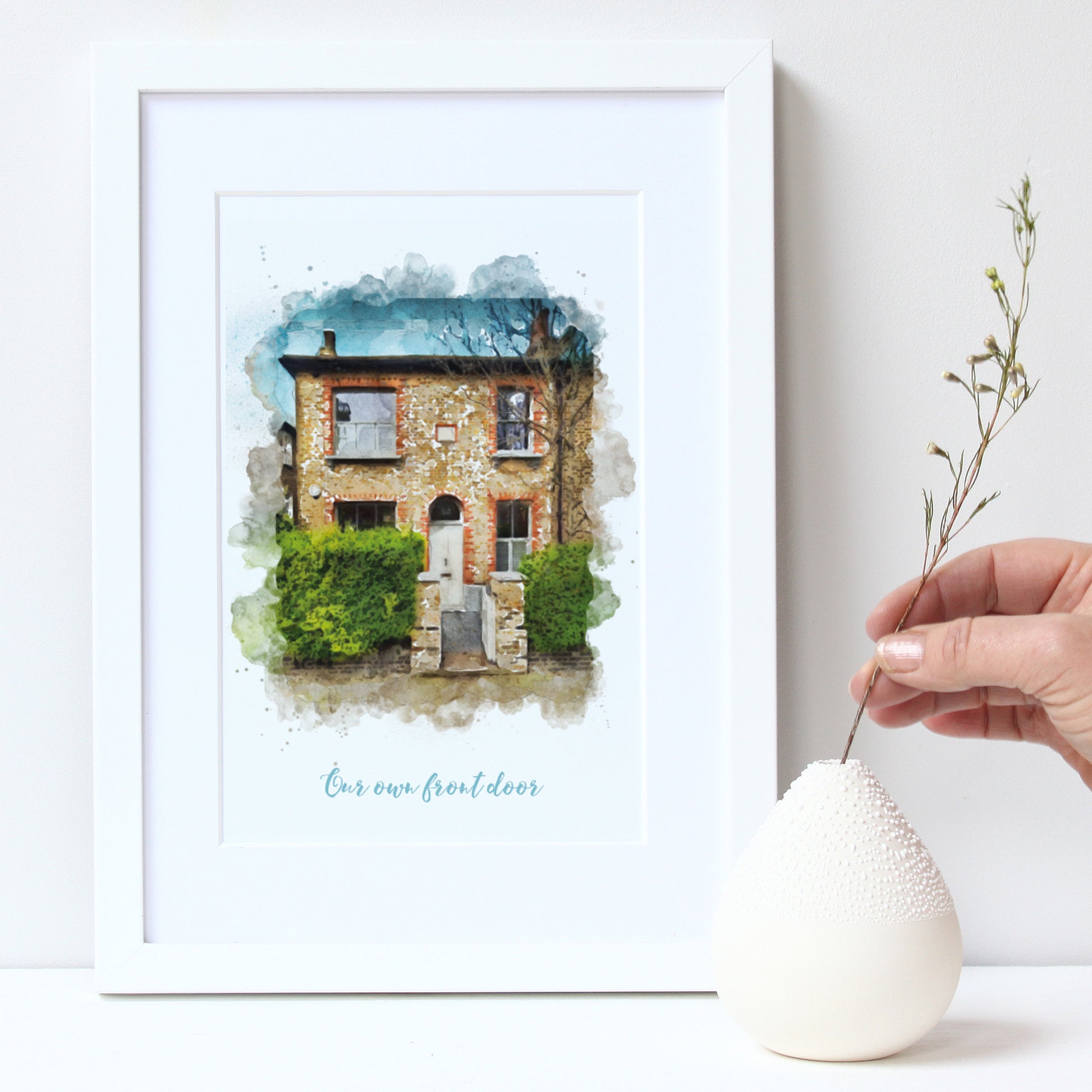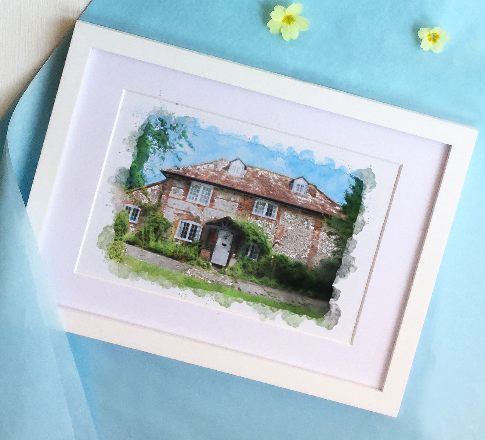 Beautiful to display in your own home or for a perfect gift to someone moving into a new home. These beautiful watercolour illustrations are taken from a photograph that you supply to us, the finished style is soft with subtle splashes and soft random edges and shows your house in the best possible light. The illustrations are in full colour and are printed on heavy textured watercolour paper, edged with a thick mount and finished in a quality wooden frame.
