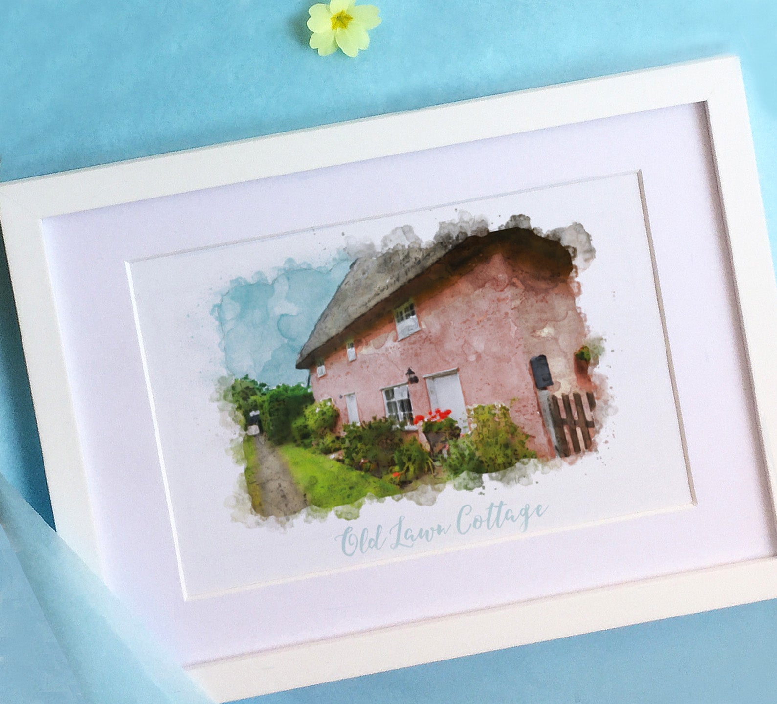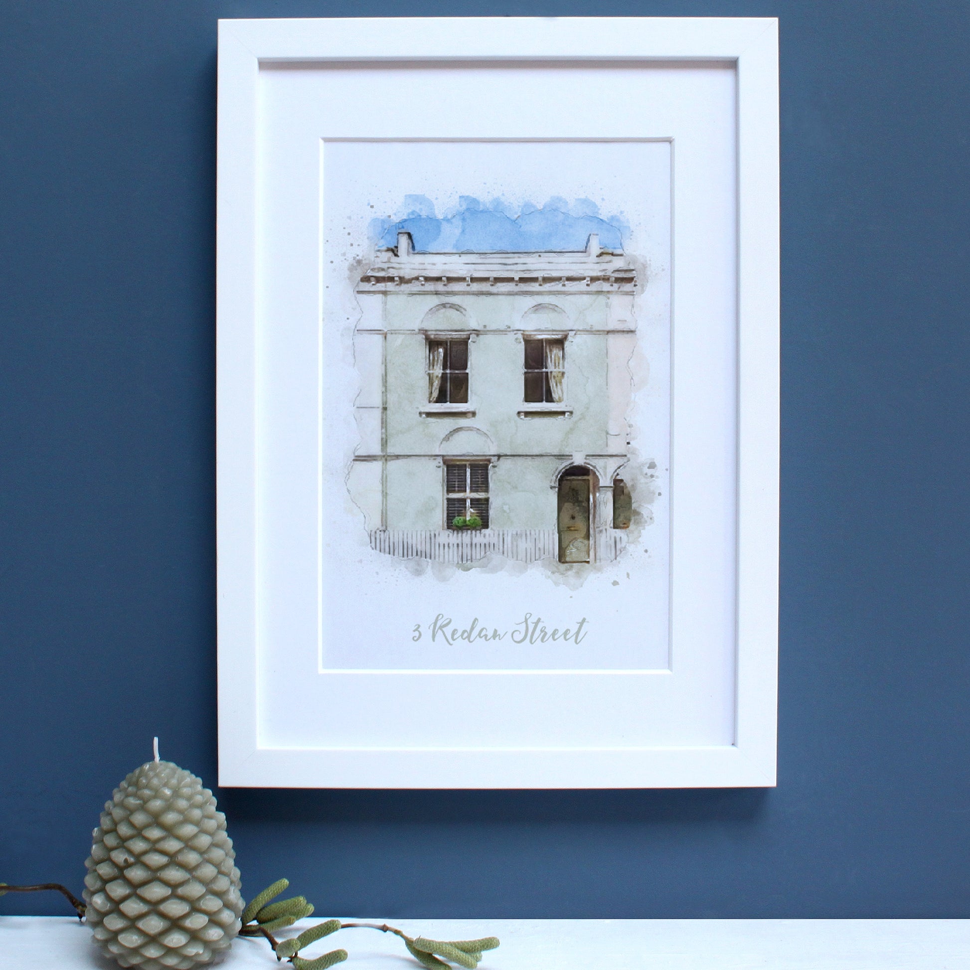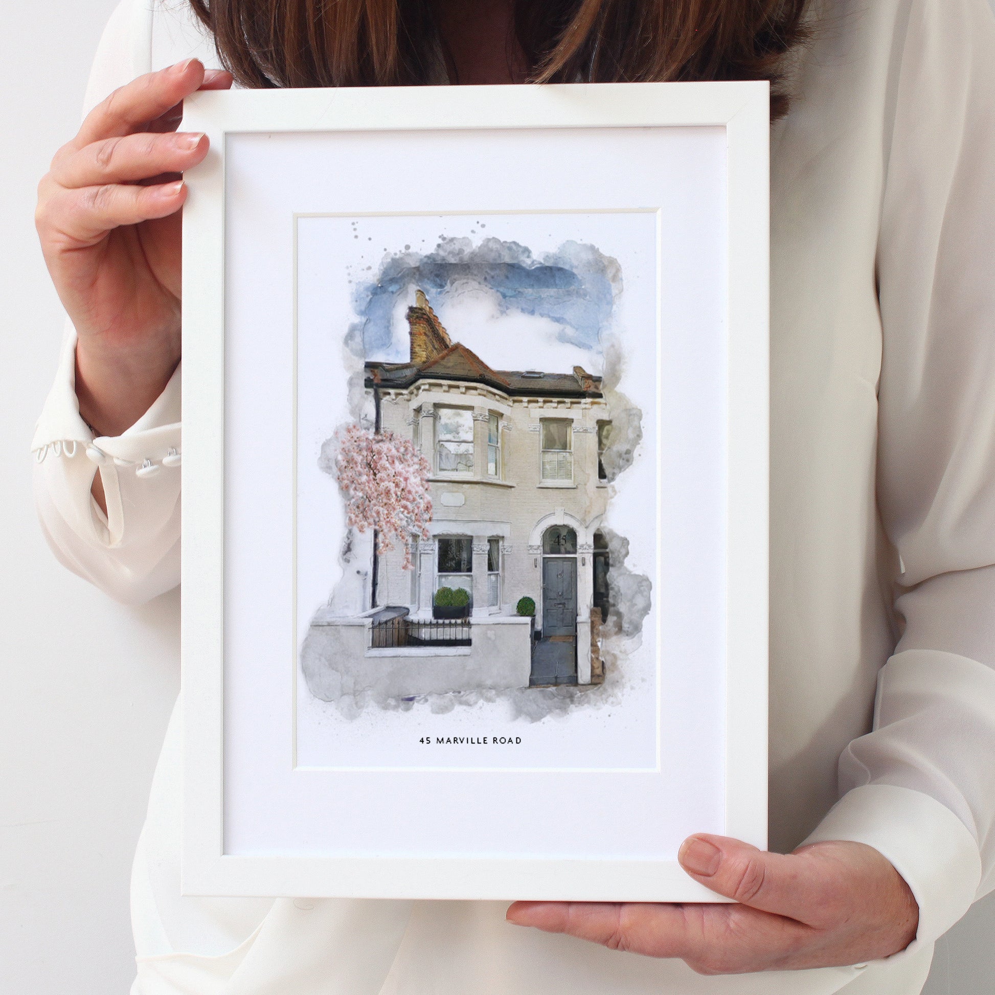 Beautiful to display in your own home or for a perfect gift to someone moving into a new home. These beautiful watercolour illustrations are taken from a photograph that you supply to us, the finished style is soft with subtle splashes and soft random edges and shows your house in the best possible light. The illustrations are in full colour and are printed on heavy textured watercolour paper, edged with a thick mount and finished in a quality wooden frame.
