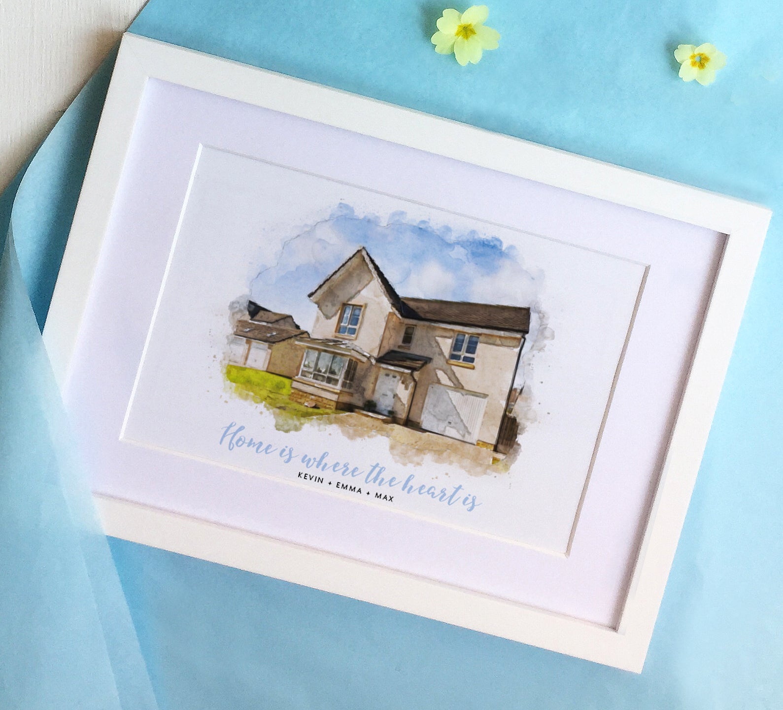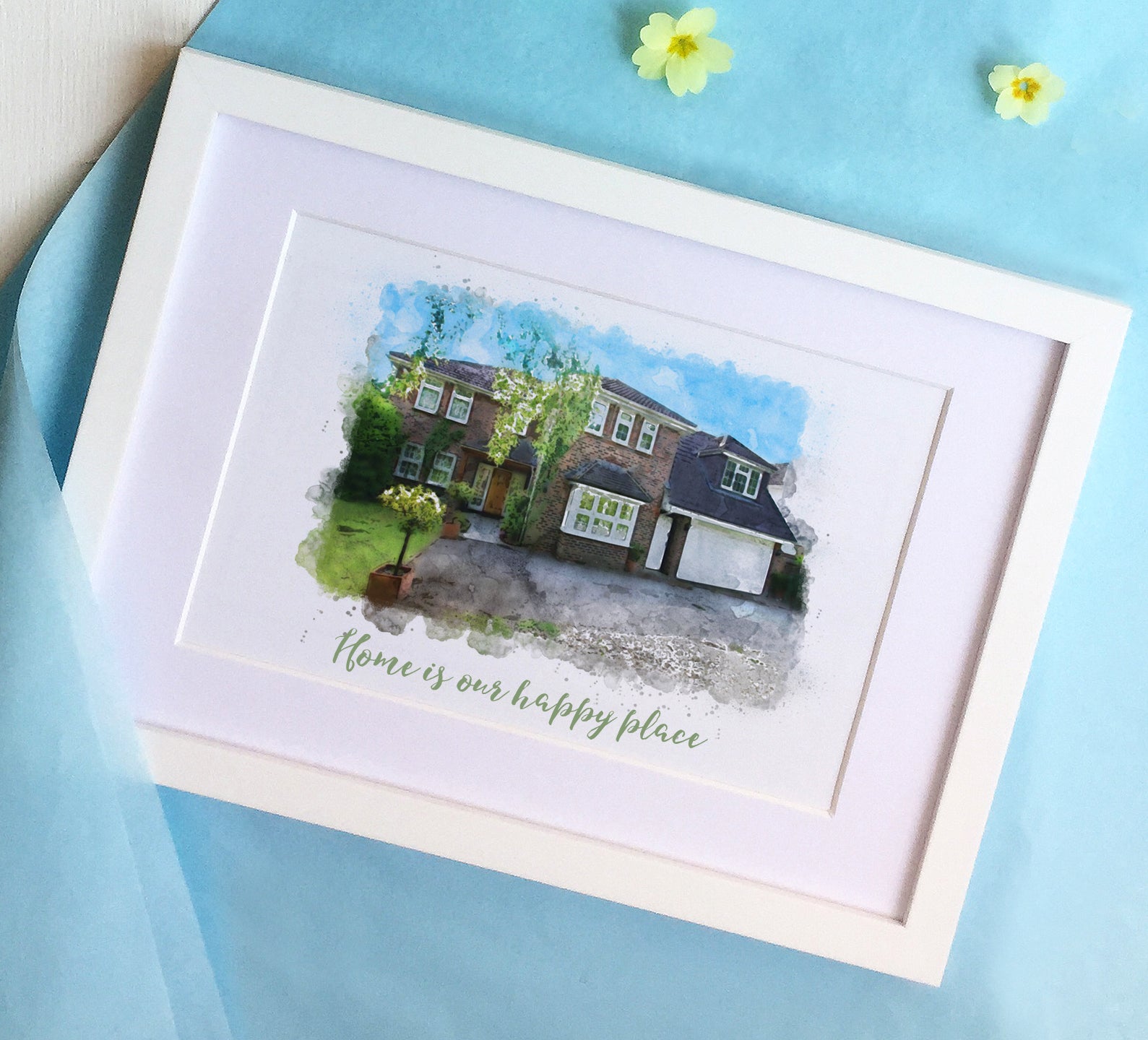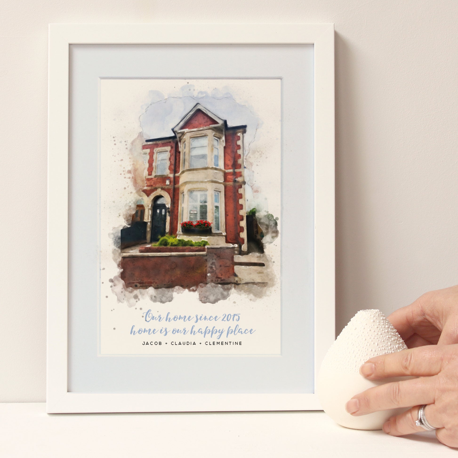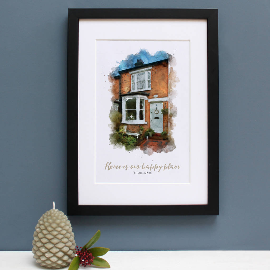 Treat yourself or a friend to a stylish watercolour style portrait of your home, complete with quote with all the occupants including pets!