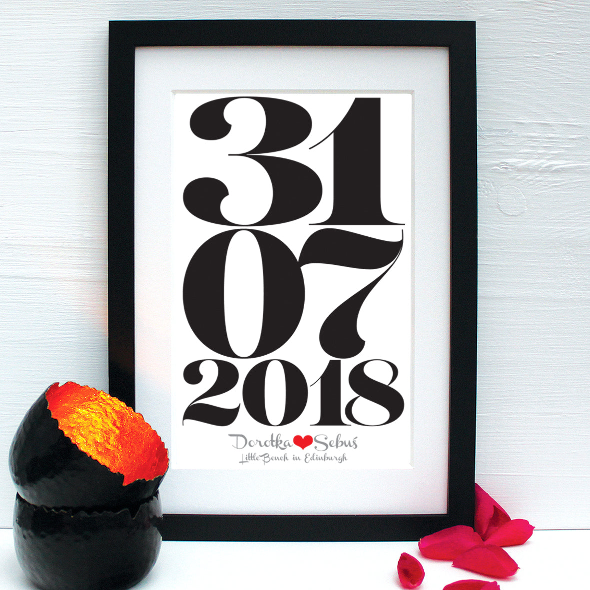 This modern framed print will look good in most settings with its attractive curvy numerals and script typeface underneath, finished with a curvy rich red heart to separate the names. It also has a luxurious mount to further enhance the print.
