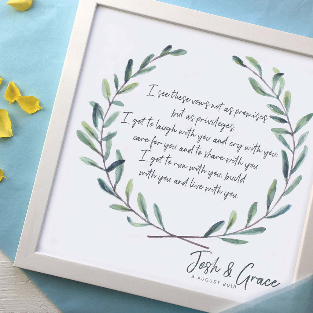 Perfect as a lasting reminder of your vows from your wedding or civil ceremony. These wedding vows framed features a delicate watercolour wreath in varying shades of green, your vows are displayed in an elegant script typeface in the middle of the foliage. You can choose to have the whole of your vows or part of them on the print. You can also have your names at the bottom of the print in the script typeface with a date of your wedding in simple, modern typography.