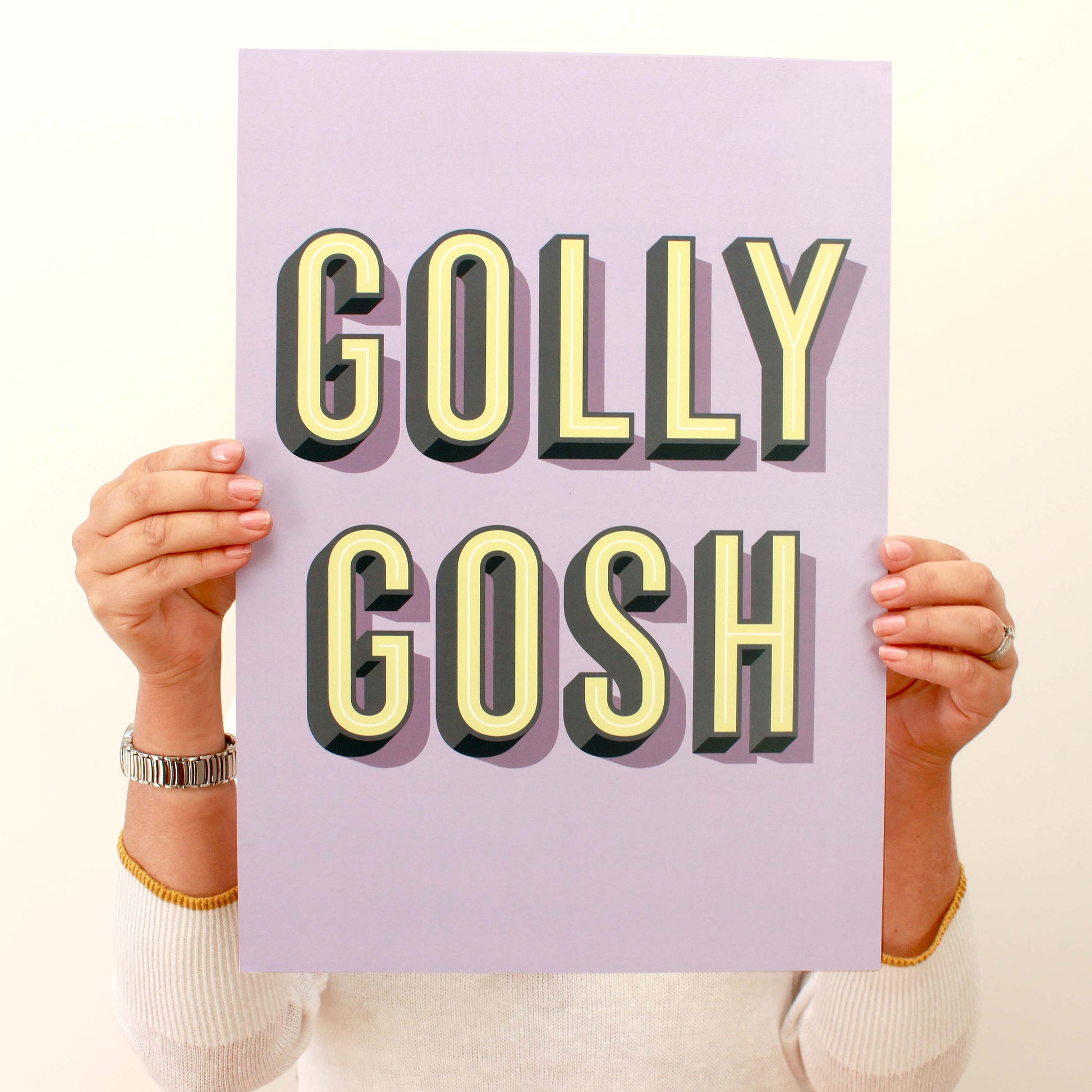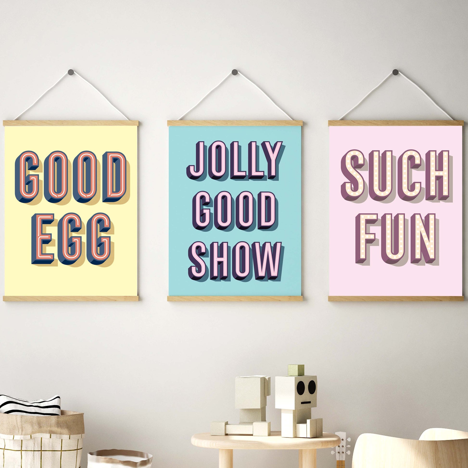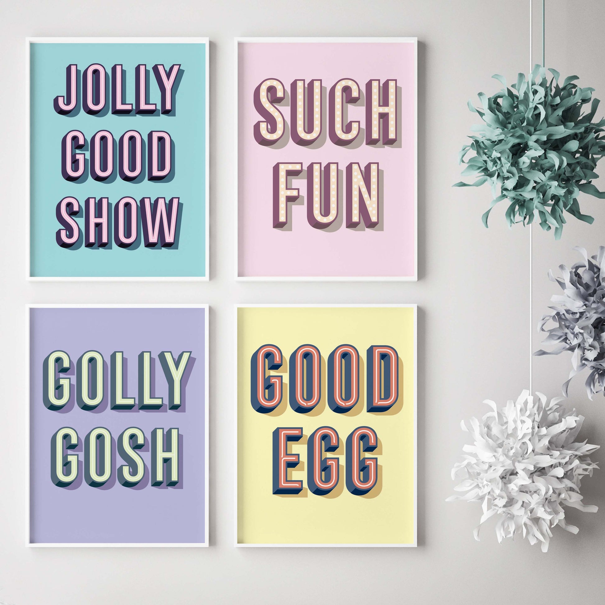 Perfect to celebrate a new job, a great achievement, or for a lovely treat for yourself, these A3 posters are available in four different designs. 'Jolly Good Show' with aubergine and pink lettering on a pale turquoise background. 'Golly Gosh' with dark grey and mint green lettering on a pale lilac background. 'Such Fun' with plum and apricot lettering on a pale pink background. 'Good Egg' with dark blue and terracotta lettering on a pale lemon background. These posters will look stunning displayed on their own or in a group.