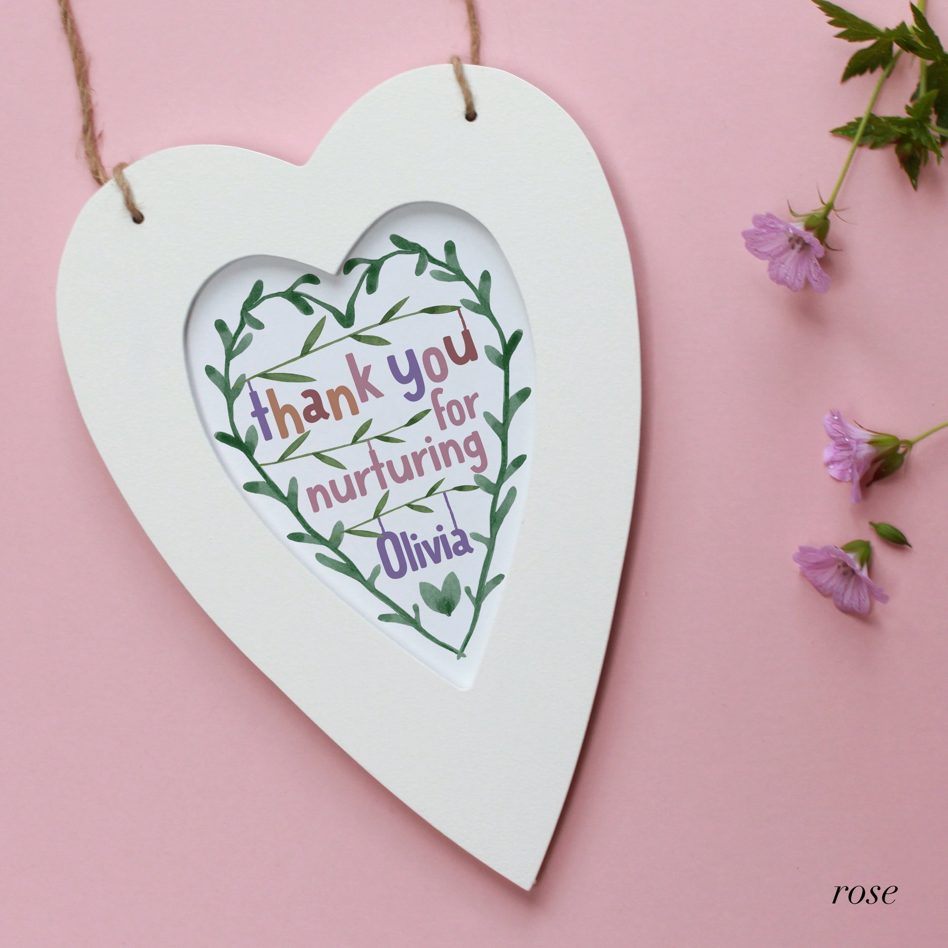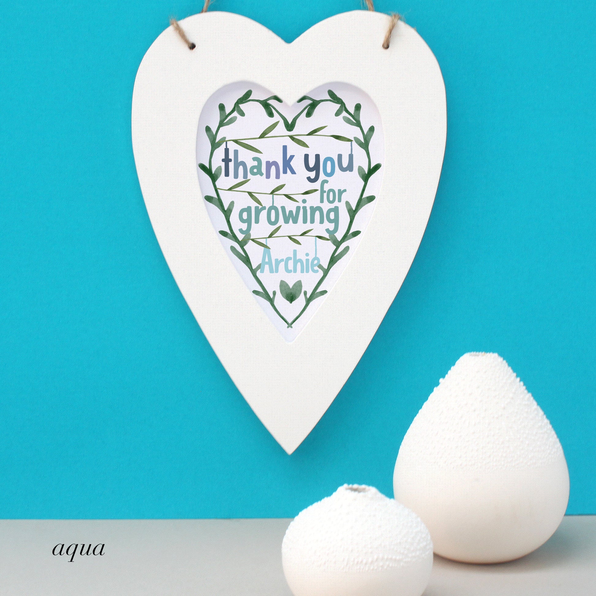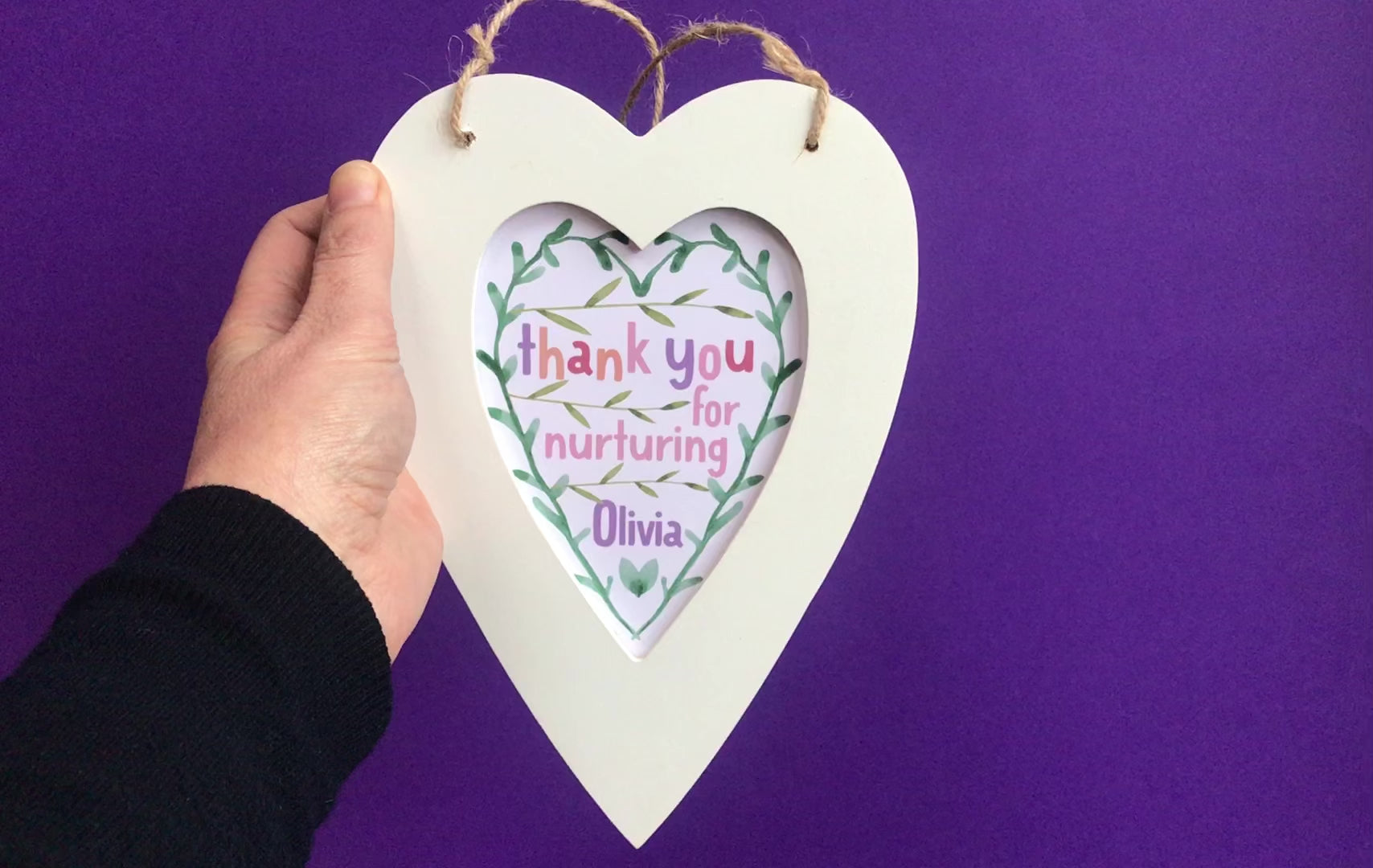 This unique design features a watercolour heart wrapping around the words that you choose. Just simply supply one descriptive word and the name of your child, how about, 'thank you for nurturing Olivia, 'thank you for supporting Jack', 'thank you for caring for Archie', thank you for helping Joy'? Just add your own descriptive word and we will create a one-off gift that they'll cherish for years to come.